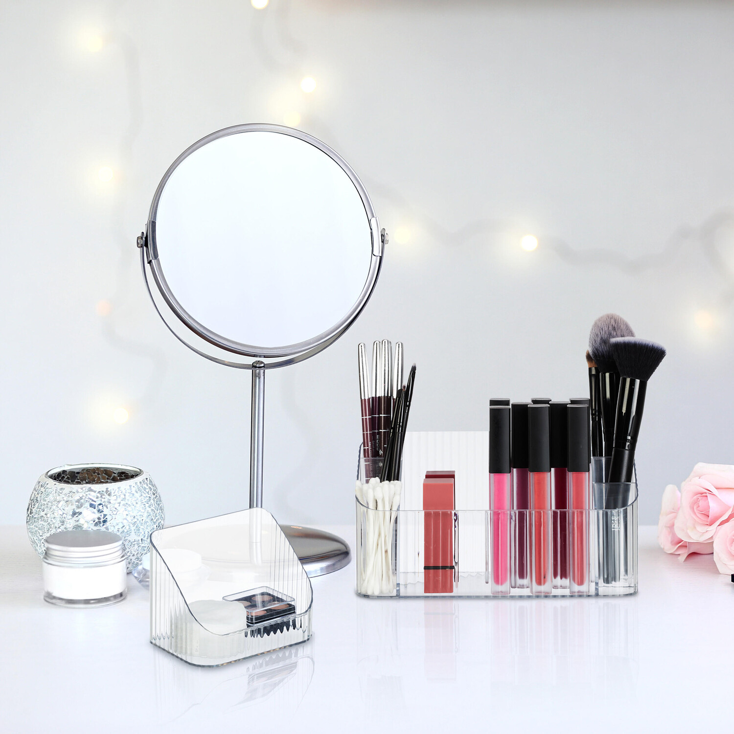 Особенности: Практичный набор из 2 шт. Идеально подходит для косметических средствДля ванной комнаты и туалетного столикаИзготовлен из прочного пластика Неподвластный времени реечный вид