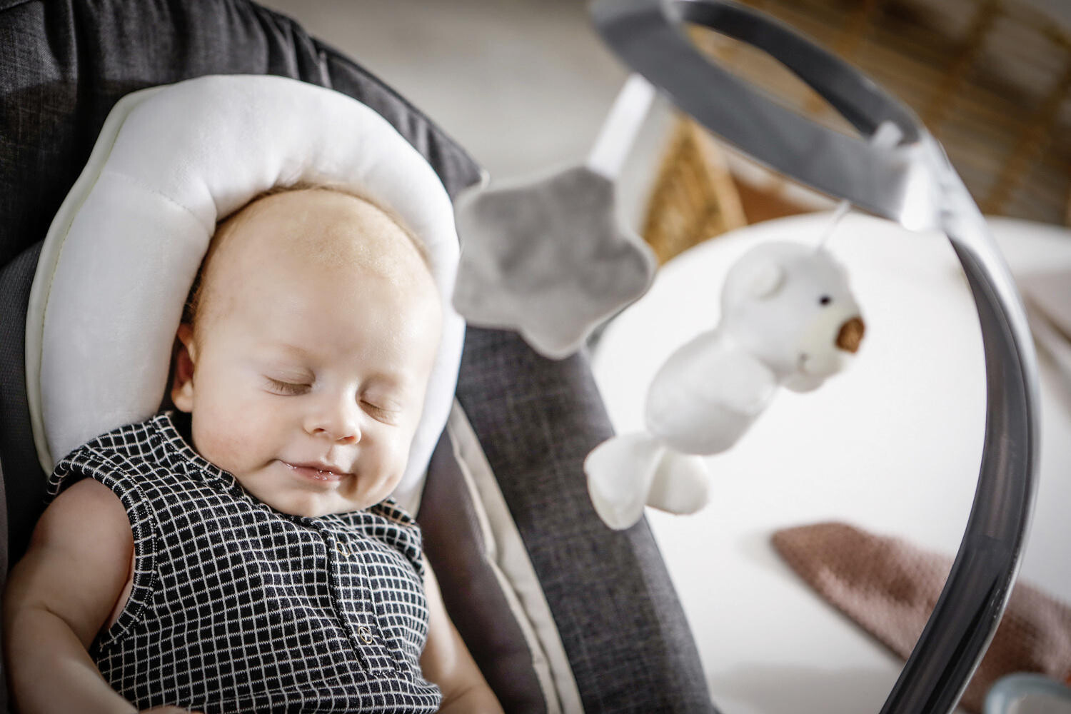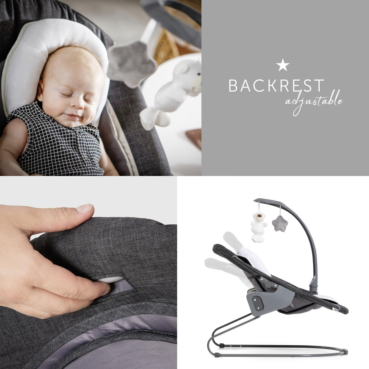 - Аксессуары в комплекте: мягкий текстильный чехол, вешалка для игрушек, каркас для качалки, каркас для шезлонга