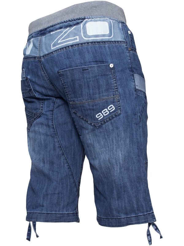 Дизайнерские мужские джинсовые шорты Enzo с эластичной резинкой на талии синего цвета, 70 % хлопок, 30 % полиэстер, эластичный пояс в рубчик с кулиской, 6 карманов, включая карман для монет, фирменные пуговицы и заклепки, застежка на пуговицы, дизайн кроя и шитья, контрастная строчка, принт на детали задняя кокетка и передний карман, регулируемые завязки с напечатанными деталями на подоле, можно стирать в машине, идеально подходит для отдыха и работы.