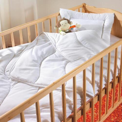 Детская кроватка белого цвета, состоящая из двух предметов, обеспечит спокойный сон вашему малышу. Пока он укрывается одеялом с волнистой стежкой (ок. 100 х 135 см), подушка (ок. 40 х 60 см) обеспечивает идеальный комфорт. Наполнитель из TENCEL Lyocell и Dacron обеспечивает ощущение мягкости в положении лежа. Благодаря термобалансирующим и влагорегулирующим свойствам кровать подходит и людям с аллергией на домашнюю пыль. Чистка также не требует усилий, поскольку текстиль можно стирать в машине при температуре до 60 °C. С этим комплектом детской кровати (2 предмета) белого цвета ваша возлюбленная может рассчитывать на приятные сны!
