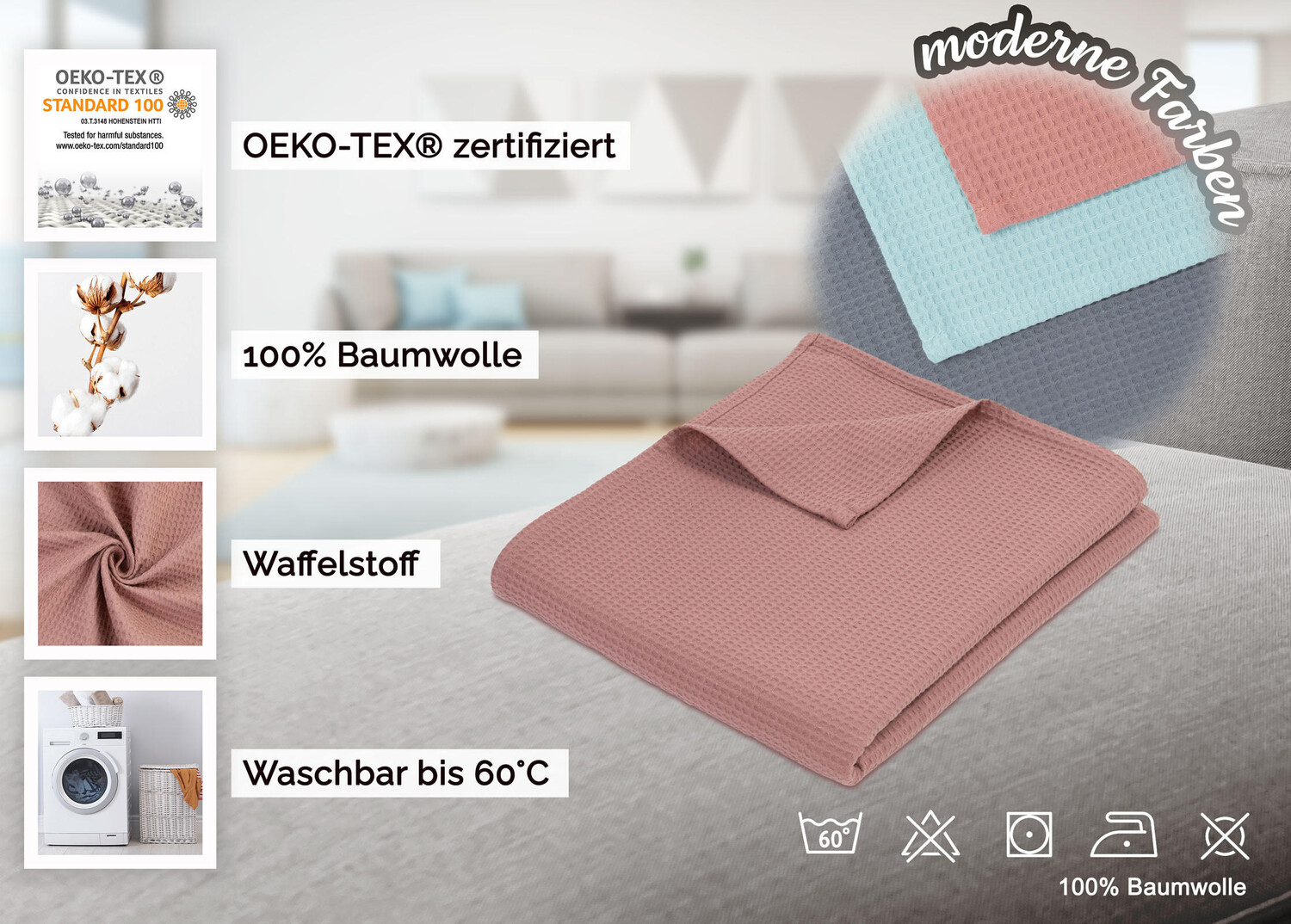 Наше одеяло можно использовать в качестве покрывала на кровати, по вечерам на террасе, в качестве пляжного одеяла или диванного одеяла. Обязательно должно быть в каждом доме. Красивое розовое одеяло для дивана изготовлено из 100% хлопка и имеет размеры 150х200 см. Плотность материала 200 г/м² делает его легким и идеальным для путешествий. Одеяло с вафельным узором создает красивую атмосферу и поэтому является вечным аксессуаром для дома. Поскольку материал обработан хлопком, одеяло подходит для людей с чувствительной кожей. Вы также можете постирать диванное одеяло при температуре 60°C, а затем положить его в сушилку.