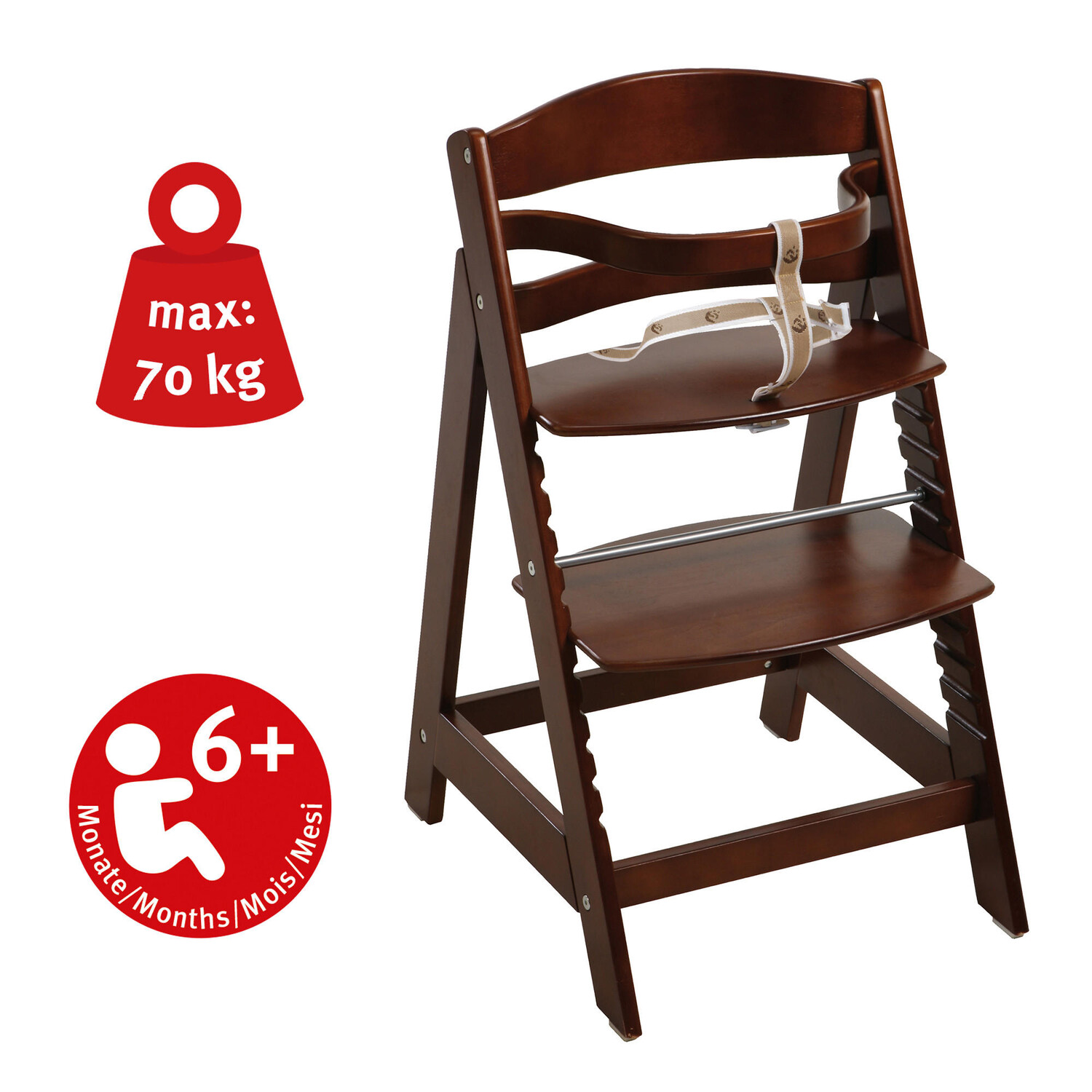 Особенности: Стульчик для кормления Sit Up Flex - коричневая морилка - с кронштейном для хранения и системой ремней - спинка из формованного дерева - спинка, состоящая из двух частей - сиденье и подножка. Высота регулируется.