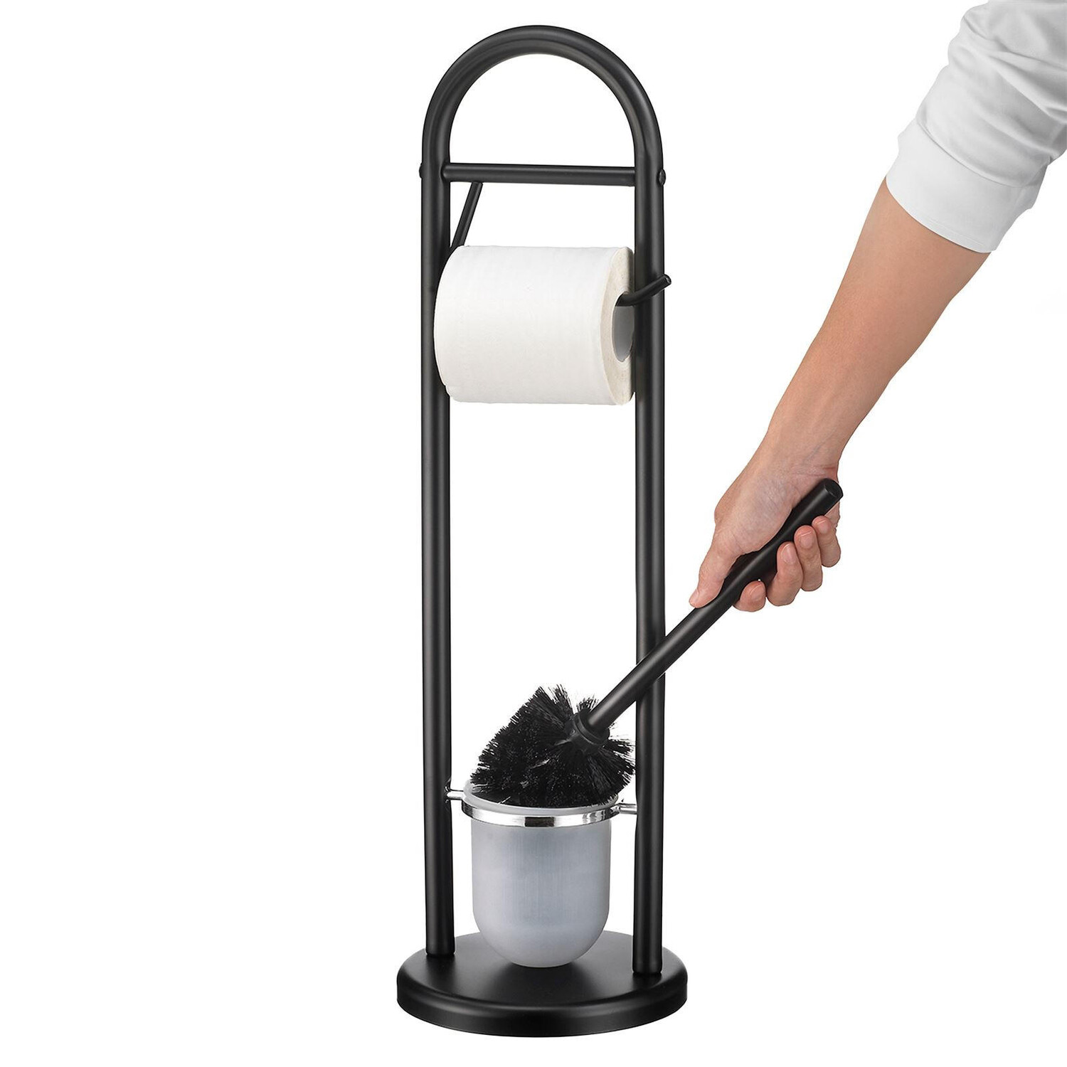 Держатель для туалетной бумаги EGONДержатель для туалетной бумаги EGON сочетает в себе функциональность и стильный дизайн в вашей ванной комнате. Благодаря современному округлому виду и матовой черной отделке он органично впишется в любой интерьер ванной комнаты. Встроенный держатель для щеток с подходящей ершиком для унитаза особенно практичен. Свободностоящая конструкция позволяет легко устанавливать устройство без сверления. Кроме того, круглая основа обеспечивает надежную подставку, а круглая ручка облегчает перемещение.Описание материала:Рамка основания и стержень щетки изготовлены из металла, окрашенного в черный (матовый) цветКисть и держатель из пластика (держатель щетки из матового стекла) внешний вид)Особенности:Съемный держатель щеткиКруглое основание для устойчивостиСовременный закругленный дизайнДоставка и сборка:Объем поставки: держатель для туалетной бумаги, включая щеткуТовар поставляется в разобранном видеДоставка осуществляется службой доставки посылками.