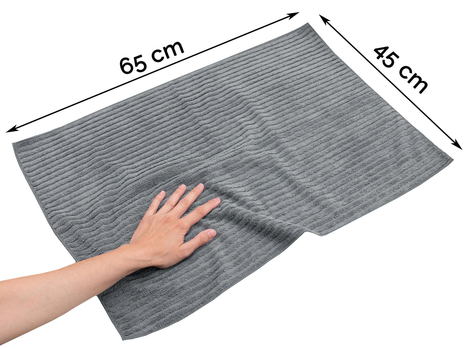 Салфетка для чистки, которая совсем не похожа на тряпку для чистки — эту чистящую салфетку шикарного серого цвета можно просто оставить на кухне или в ванной. Полотенце из микрофибры ребристое с одной стороны и гладкое с другой. Стильный дизайн подойдет к любому интерьеру – настоящая альтернатива цветным тряпкам. Многофункциональная салфетка подходит для чистки окон, зеркал, фурнитуры, раковин, плитки, а также для полировки автомобиля или стекол и столовых приборов. Благодаря материалу, состоящему из 80 % полиэстера и 20 % полиамида, вы получаете блеск без разводов и ворса. Когда она высохнет, вы также можете использовать чистящую ткань в качестве тряпки. Если это не настоящий универсал! Чтобы у вас всегда было под рукой достаточное количество салфеток, впитывающая салфетка из микрофибры поставляется в практичном наборе из 10 штук. Полотна имеют размер 45х65 см и плотность материала 320 г/кв.м. Для немедленного повторного использования универсальные салфетки можно постирать в стиральной машине при температуре 60°C и снова быстро высушить на свежем воздухе.