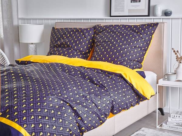 Современное хлопковое постельное белье темно-синего и желтого цветов. Этот красивый и удобный комплект кровати в модном сочетании темно-синего и желтого цветов украсит каждую спальню и комнату для гостей и гарантирует приятные сны. Тонкий, но очень модный узор является настоящей изюминкой и может превратить любую современную и эклектичную комнату в декоративный храм для сна. Благодаря прочному дизайну из высококачественного хлопкового сатина и классической застежке на пуговицы постельное белье чрезвычайно приятно для кожи, практично, пропускает воздух и регулирует влажность.