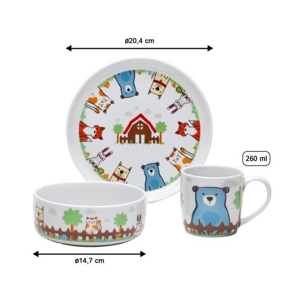 Наш красочный детский набор посуды, изготовленный из высококачественного фарфора, просто необходим каждому маленькому гурману. Будь то завтрак, обед, ужин или здоровый перекус, детский сервис просто обеспечит хорошее настроение за обеденным столом. Помимо красивого дизайна, прочная фарфоровая посуда также впечатляет своими практичными свойствами: ее можно мыть в посудомоечной машине и использовать в микроволновой печи, что делает ее идеальной для повседневного использования. Набор, состоящий из детской тарелки, зерновой миски и поилки, также является прекрасной идеей подарка на рождение, крещение или день рождения.