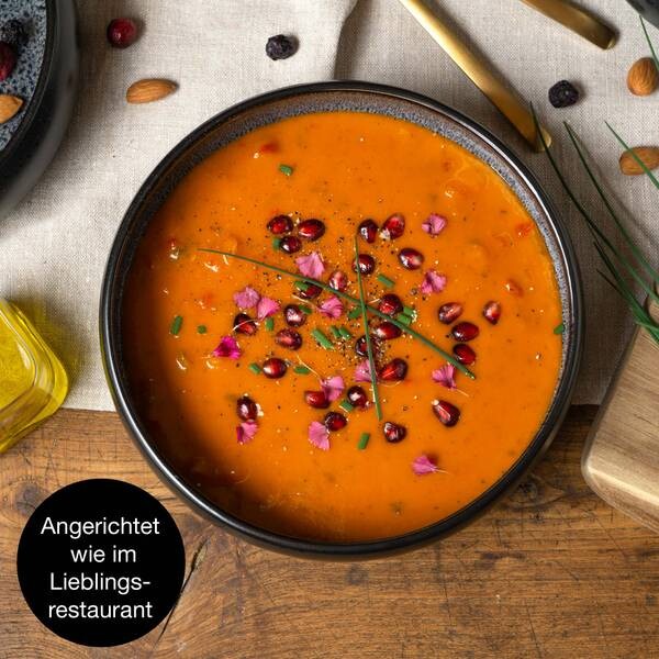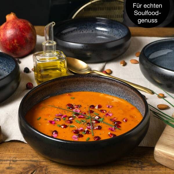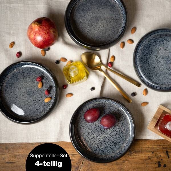 • КОМПЛЕКТАЦИЯ - Moritz & Moritz 4x суповые тарелки из керамогранита, каждая диаметром 19 см и 5 шт. высота см для супа объемом 350–800 мл, серая внутри, матовая черная снаружи, можно мыть в посудомоечной машине и использовать в микроволновой печи.