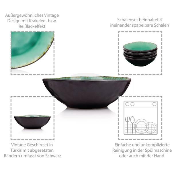Коричневые края, а также бирюзовые и кракелюрные поверхности создают уникальную гармонию, оставляющую ни с чем не сравнимое впечатление. Эффект кракле, также известный как слезоточивый лак, при высыхании сжимается, образуя узор из трещин. Этот эффект придает чашам особую глубину и придает набору мисок чудесный винтажный вид.