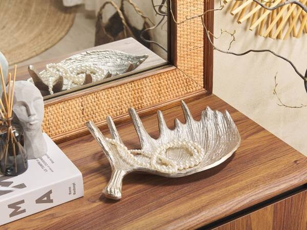 Декоративная чаша ручной работы под рога из металла серебристого цвета. Форма этой ювелирной чаши напоминает лосиные рога, поэтому она является оригинальным и эффектным аксессуаром для дома. Декоративный поднос подойдет для презентации любимых аксессуаров, а также для хранения ключей или других мелких вещей. Он изготовлен из высококачественного алюминия, который обязательно порадует вас своей прочностью, легкостью и долговечностью. Благодаря трем фетровым накладкам под корпусом стола все поверхности мебели всегда остаются защищенными. Поверхность серебристого цвета идеально вписывается в любой интерьер в деревенском стиле или стиле загородного дома.