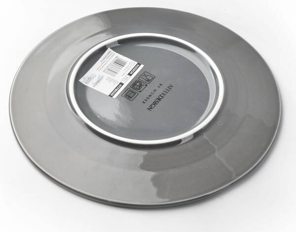 Круглая тарелка изготовлена из серого фарфора с глазурованным