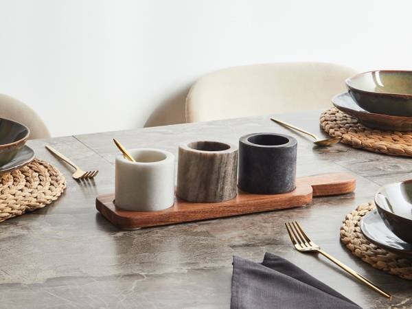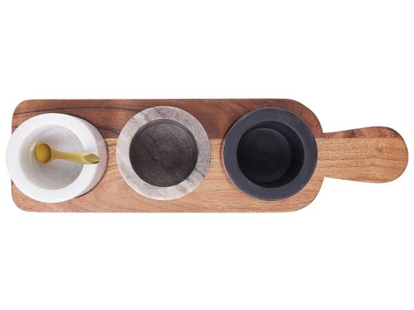 Набор из 3 небольших мисок на деревянном подносе и золотой чайной ложки. Дополните свою обеденную зону этим набором, который обязательно должен быть на каждой кухне. Чаши изготовлены из прочного и элегантного мрамора и стоят на стильном подносе из дерева акации. Набор легко переносить и чистить, он идеально подходит для подачи соусов или приправ. Продуманный дизайн также экономит место и придает элегантный вид вашему обеденному столу.