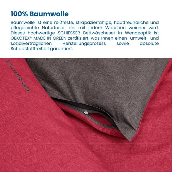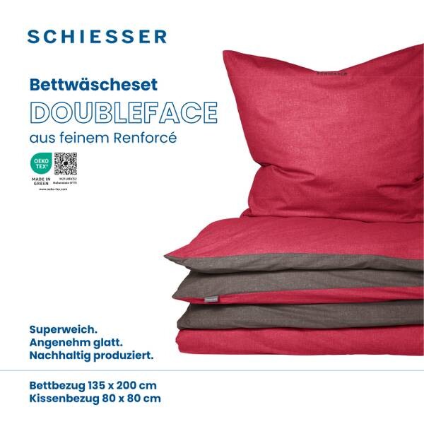 Наша классика. Невероятно мягкий чистый хлопок приятной гладкости, качество Renforceé, двусторонний дизайн с эффектом меланжа. Doubleface — это постельное белье такое, какое мы любим. Дышащее постельное белье идеально подходит для теплого времени года. Насыщенные цвета в сочетании с нейтральными серыми тонами, молния в тон и элегантная вышивка Schiesser на наволочке делают Doubleface привлекательным в каждой спальне. Простой комплект постельного белья изготовлен на экологически и социально ответственном производстве. В производстве не использовались синтетические химические вещества, что подтверждено независимыми институтами. Хотите еще больше двуличности? Затем расширьте свою удобную кровать с помощью подушек из нашей коллекции Doubleface. Здесь также есть другие цвета и размеры - также в размере XXL - а также уютная, теплая тонкая льняная ткань для вас в холодные месяцы.