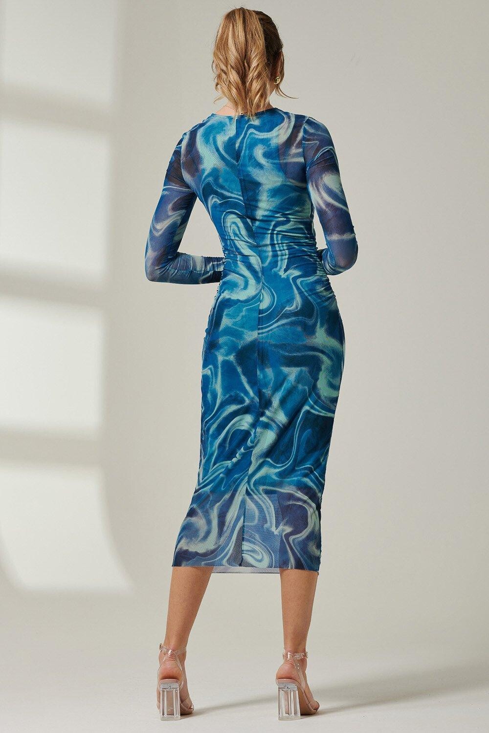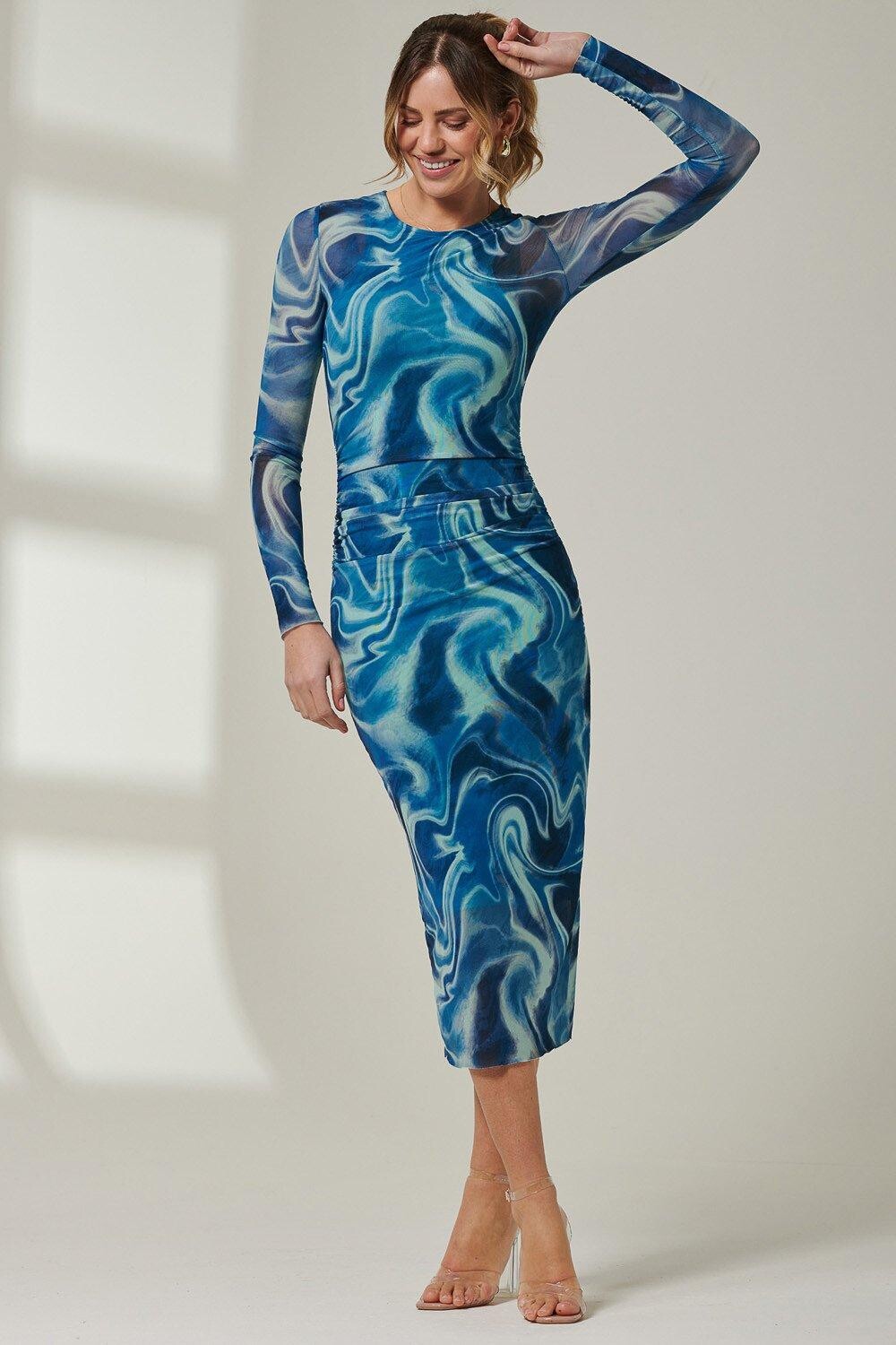Платье мидакси Mabyn Mesh с длинными рукавами от Jolie Moi, выполненное из нежной сетчатой ​​ткани и украшенное абстрактным принтом, просто незаменимо. Облегающий силуэт дополнен закругленным вырезом, длинным рукавом и рюшами. Идеально подходит для дневного или вечернего образа.