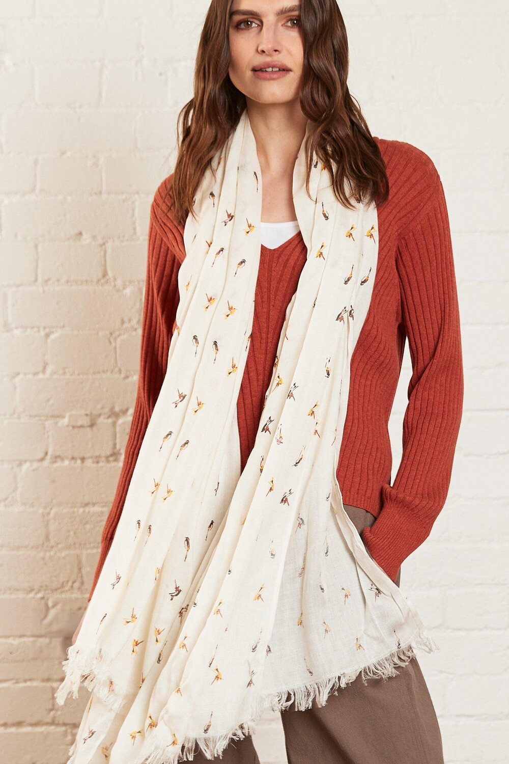 Изысканный шарф с принтом в виде элегантных колибри, изготовленный из экологически чистой вискозной марли. Простой способ добавить цвета в ваш наряд. Выбирайте цвета денима и слоновой кости.