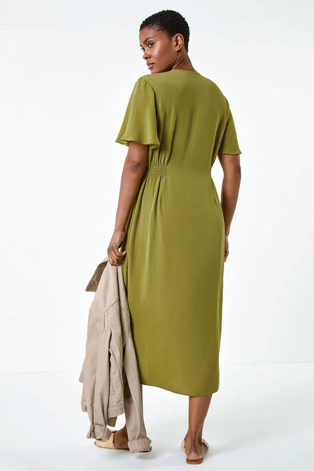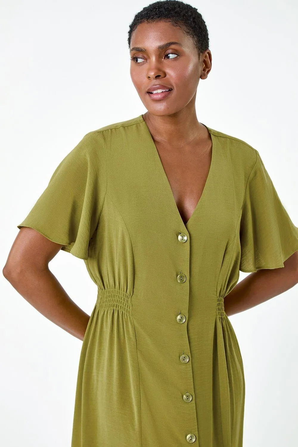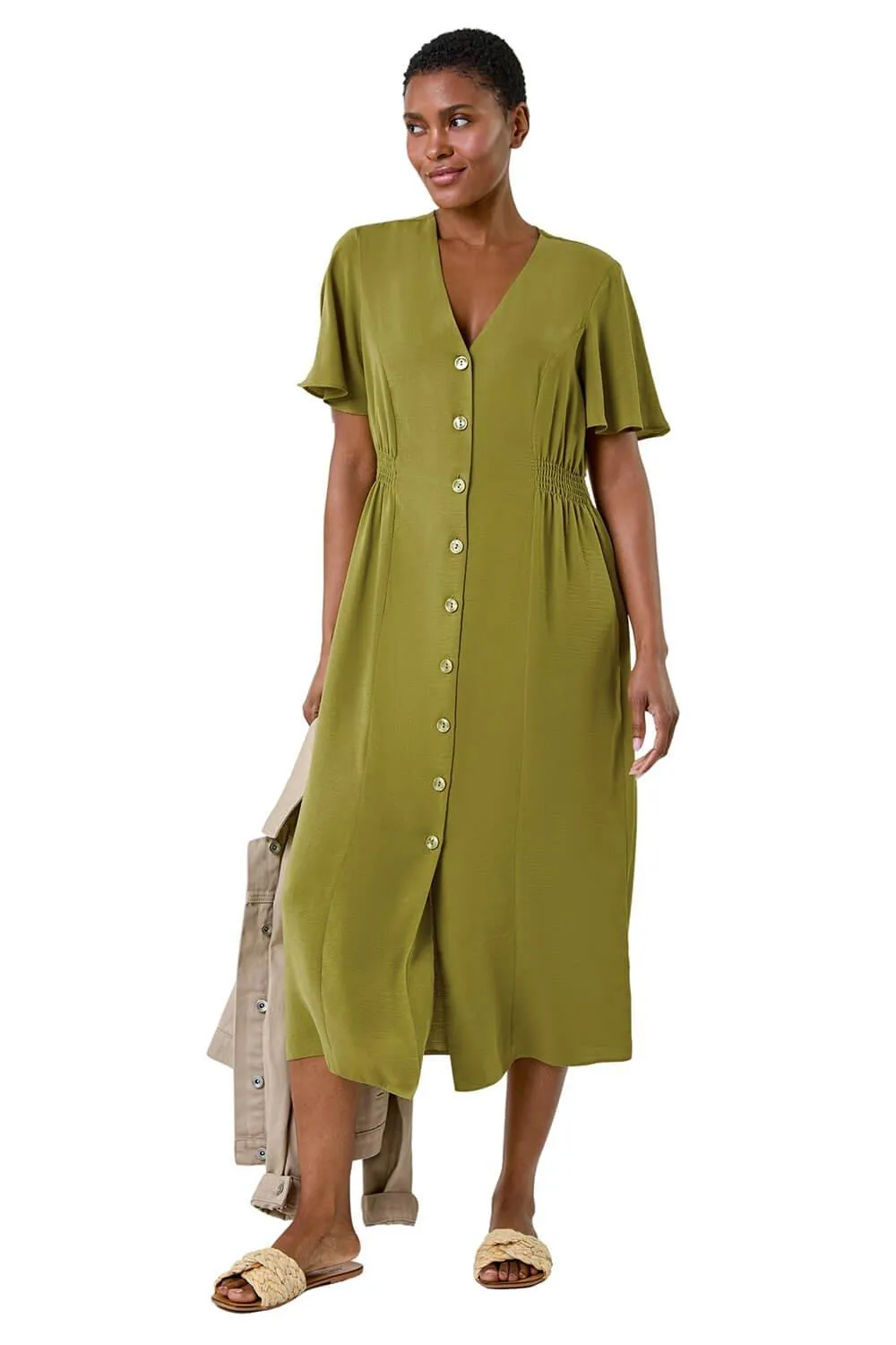 Платье-миди с присборенной пуговицей от Roman. Это универсальное платье миди с v-образным вырезом выглядит непринужденно шикарно. Это платье с короткими летящими рукавами-ангелами и эластичной талией в сборе идеально подходит для ношения без застежки. Это платье длины миди, застегивающееся спереди и выполненное из легкой ткани, идеально подходит для повседневной носки. Дополните образ сандалиями и милой джинсовой курткой для идеального пикника в парковом наряде.