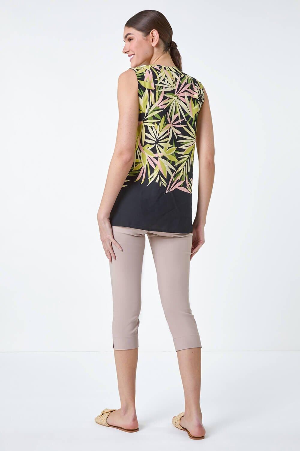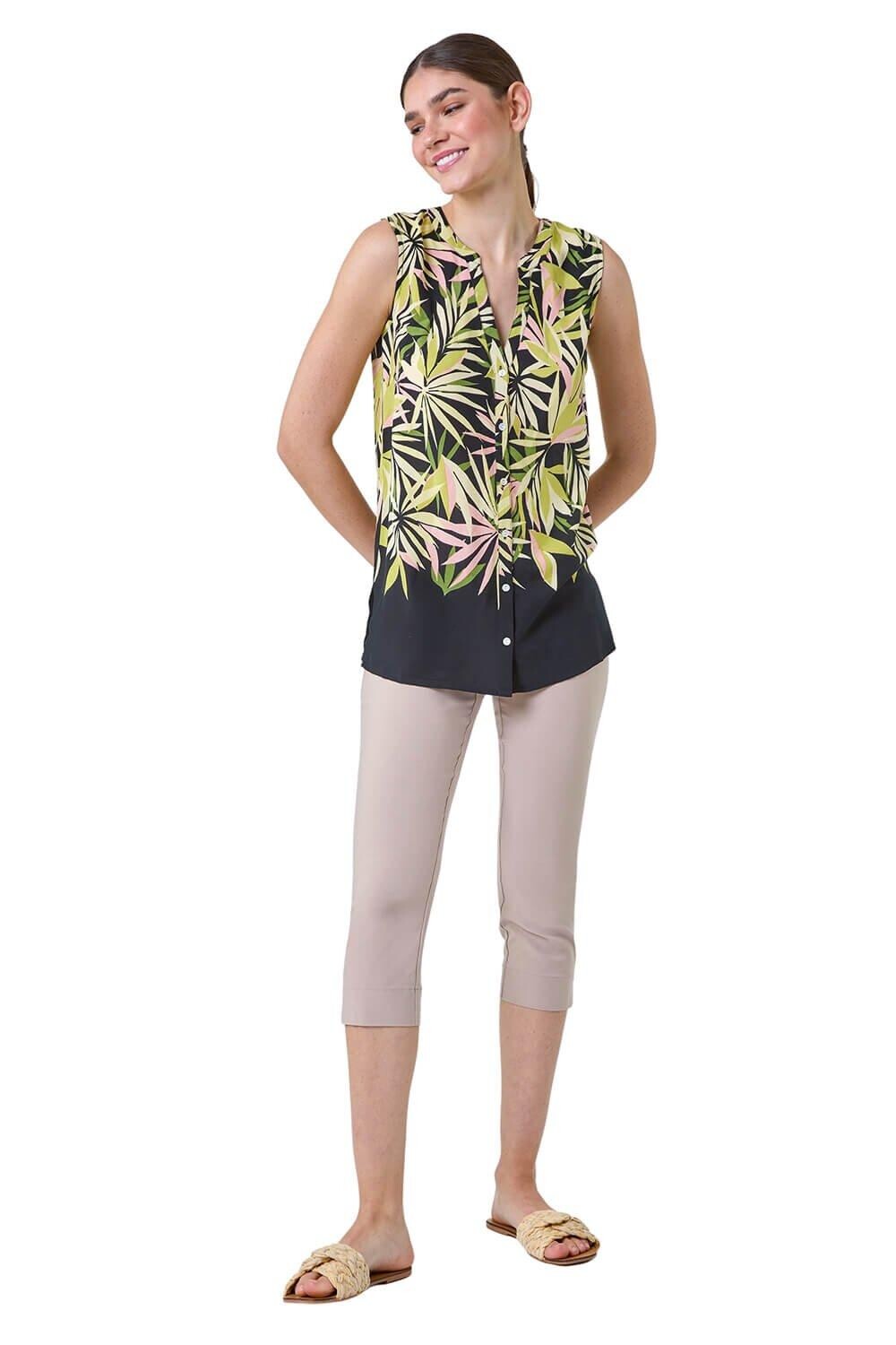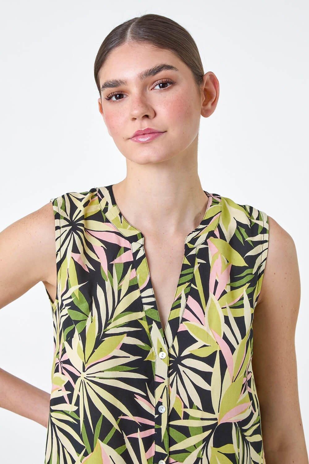 Блузка без рукавов с принтом листьев от Roman. Наслаждайтесь тропической атмосферой в этом сезоне с нашей яркой блузкой с принтом листьев. Этот топ из гладкой ткани имеет женственный вырез горловины и выполнен в летнем стиле без рукавов. Это изделие украшено ярким принтом в виде пальмовых листьев и милыми пуговицами спереди, которые создают идеальный завершающий штрих. Для прогулки по городу наденьте укороченные брюки и сандалии, а на ужин просто добавьте легкую джинсовую куртку!