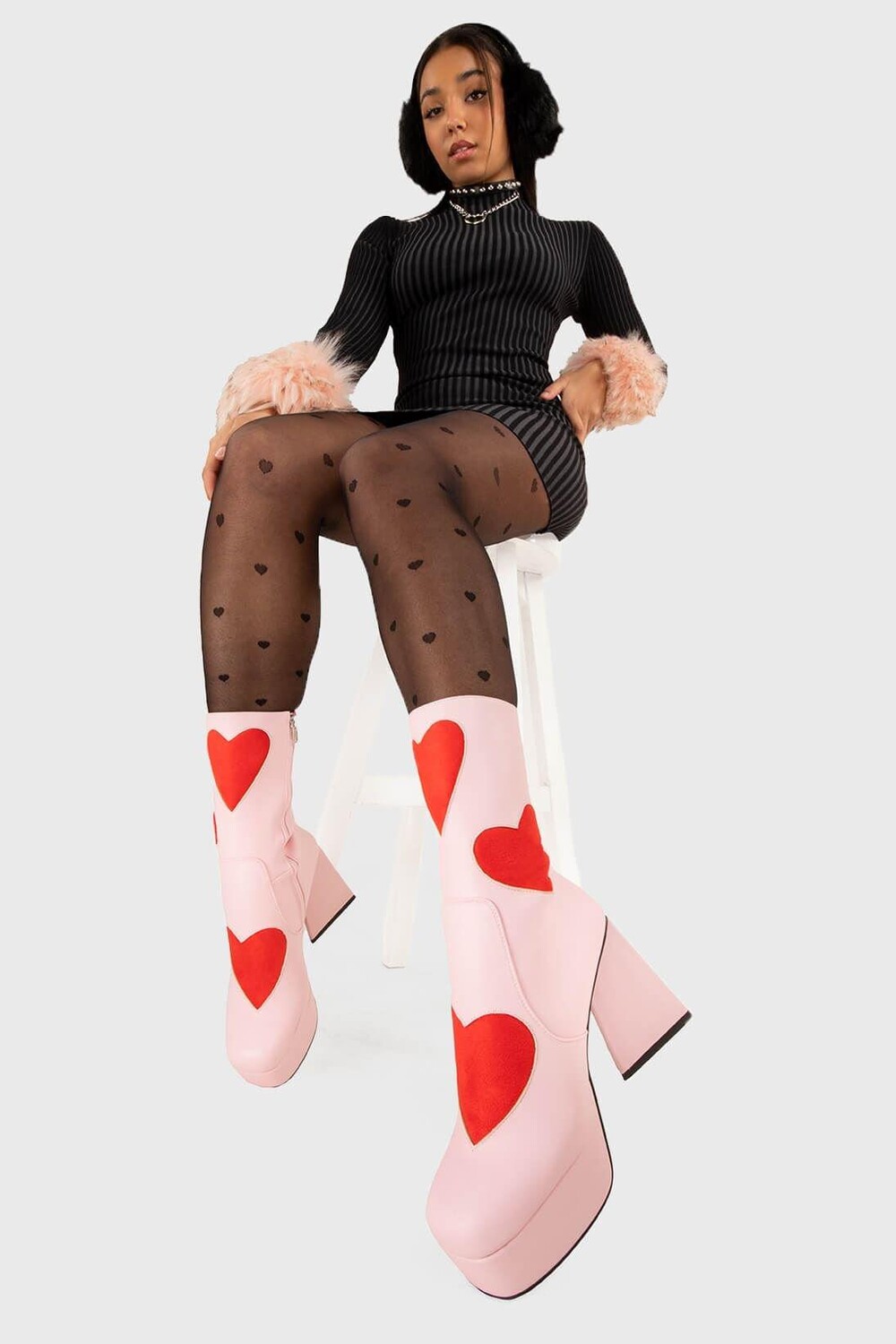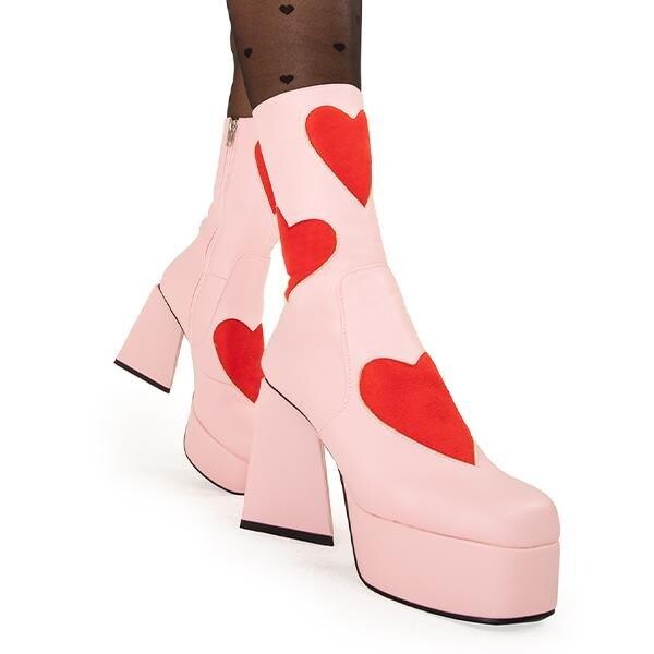 Ботильоны Lovey Dovey Letter To My Lover на платформе из розовой искусственной кожи. Эти ботинки на платформе имеют розовый ботинок с большим красным сердцем по всей поверхности. Эти ботинки на платформе, изготовленные из экологически чистых материалов и на 100% не подвергающихся жестокому обращению, настолько же этичны, насколько и шикарны. – Высота платформы – Большие красные сердечки – Длина до икры – Треугольный каблук – Высокий каблук – 100% веганский продукт Артикул: LMF 3337 – PinkPU/RedHeart