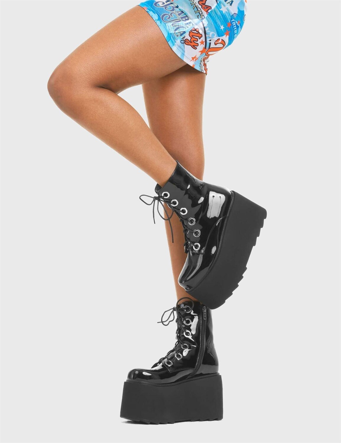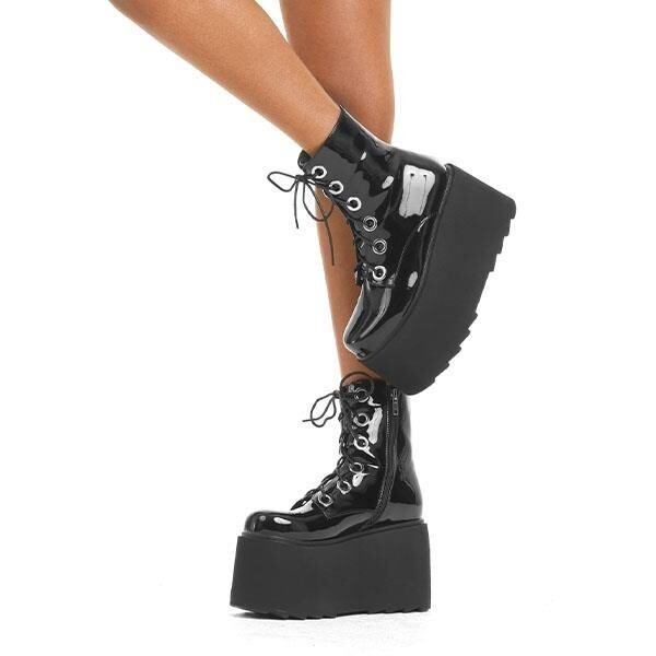Ботильоны на массивной платформе приподнятого Renegade, патент черного цвета. Эти веганские ботинки в стиле вестерн оснащены серебряными люверсами и очень стильной подошвой с эффектом акульих зубов. Изготовленные из экологически чистых материалов и на 100% без жестокого обращения, эти ботинки столь же этичны, сколь и шикарны! – Массивная платформа – Длина до щиколотки – Захват из акульих зубов – Черные шнурки – Закругленный носок – 100 % веганский продукт Артикул: LMF 3746 – BlackPAT
