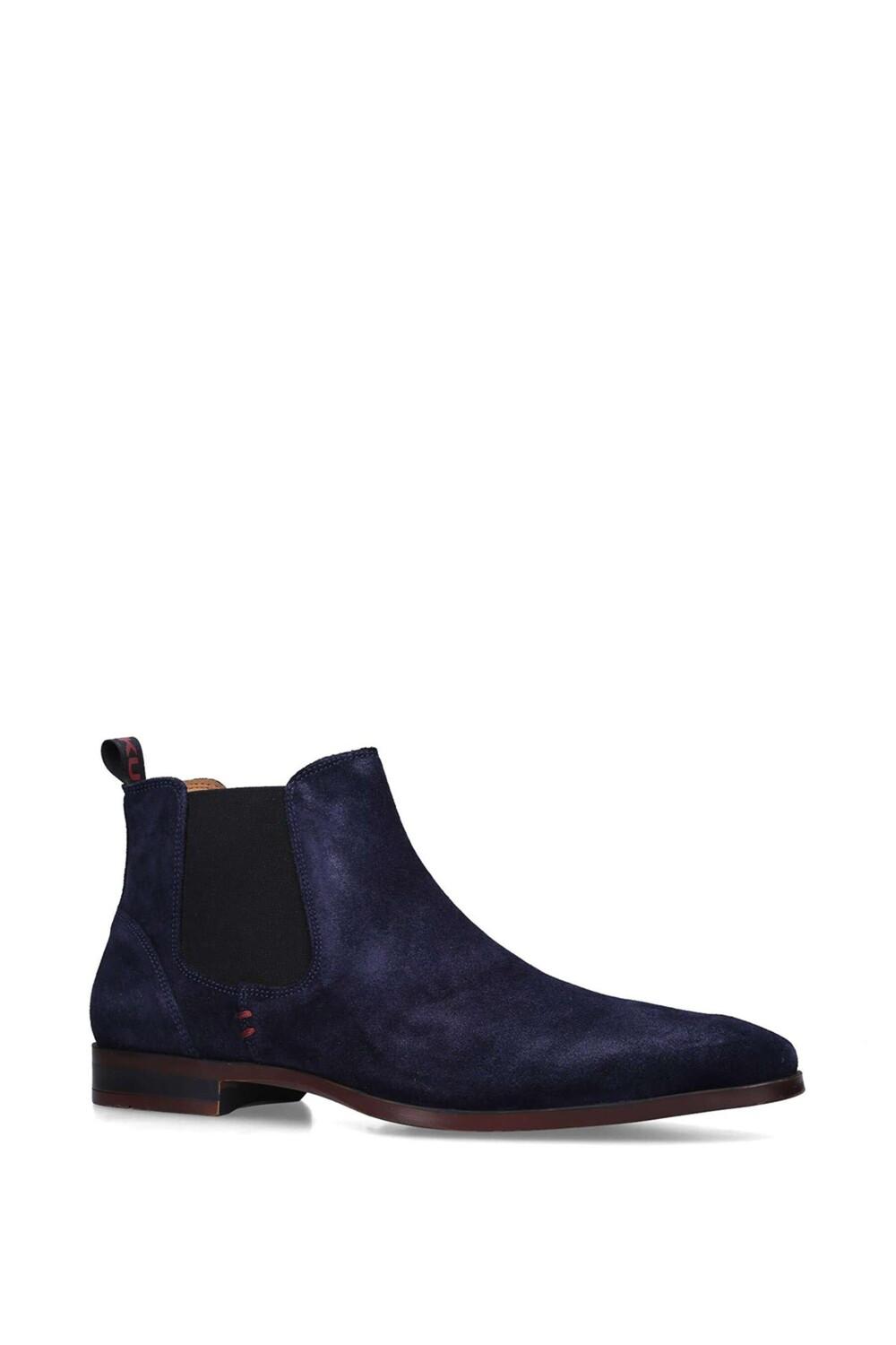 Ботинки Pax от Kurt Geiger имеют темно-синий замшевый верх с заостренным носком. С коричневой отделкой внизу ботинка.