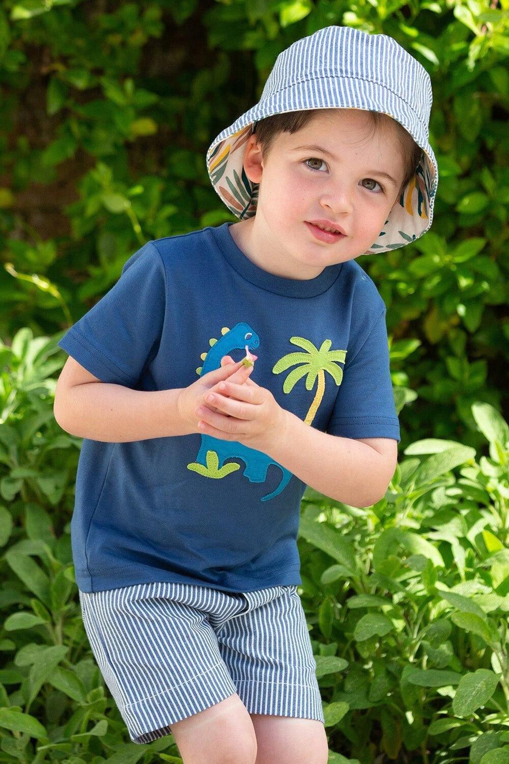 Познакомьтесь с дружелюбным брахиозавром, который когда-то бродил по земле. Эта милая темно-синяя футболка с аппликацией наверняка понравится маленьким поклонникам динозавров. Изготовлен из 100% органического хлопка с застежками-кнопками для легкой смены. .