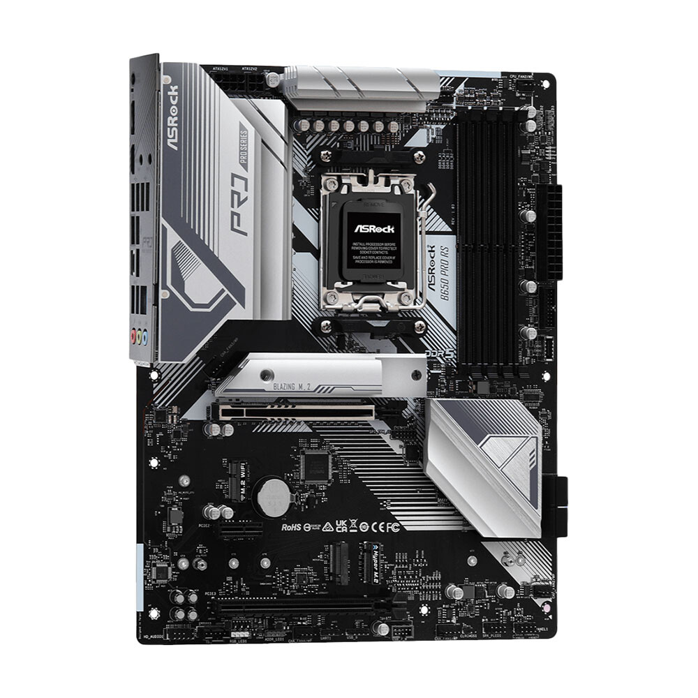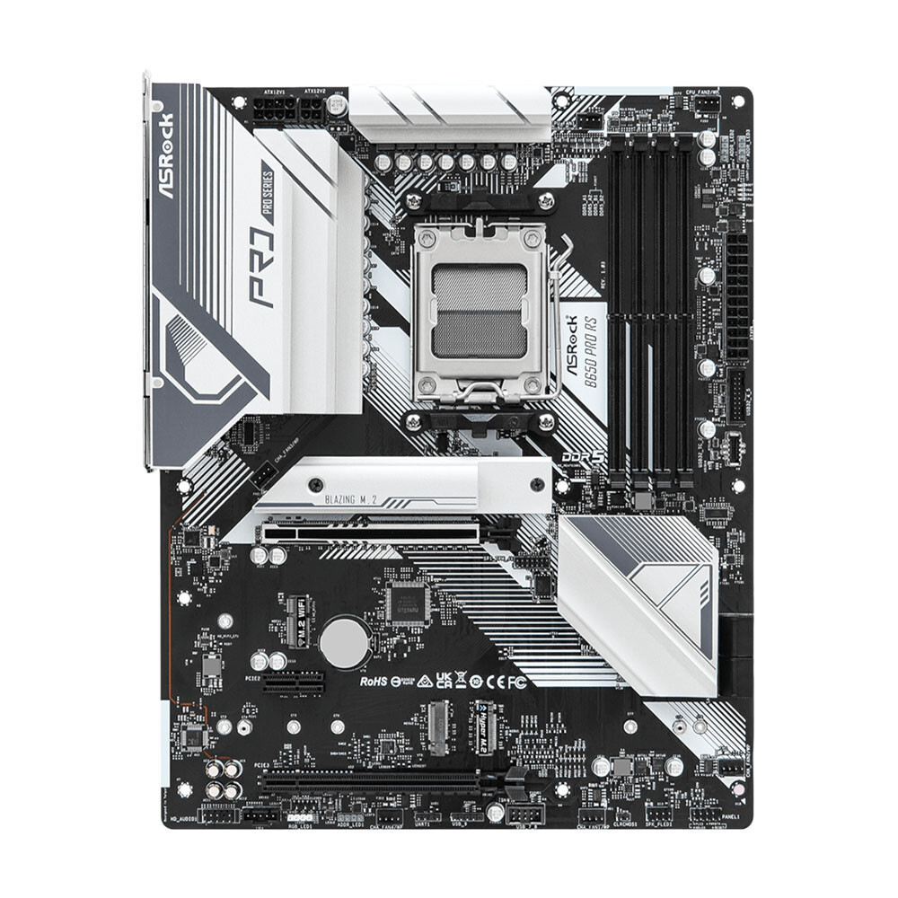 Материнская плата ASRock B650 Pro RS подходит для использования в профессиональных рабочих станциях и игровых ПК. Она выполнена на текстолите с массивными охлаждающими элементами. В конфигурацию платы входят 4 слота DIMM под установку оперативной памяти поколения DDR5, 2 слота расширения PCI-E x16, 3 разъема M.2 и 4 слота SATA для устройств хранения информации.