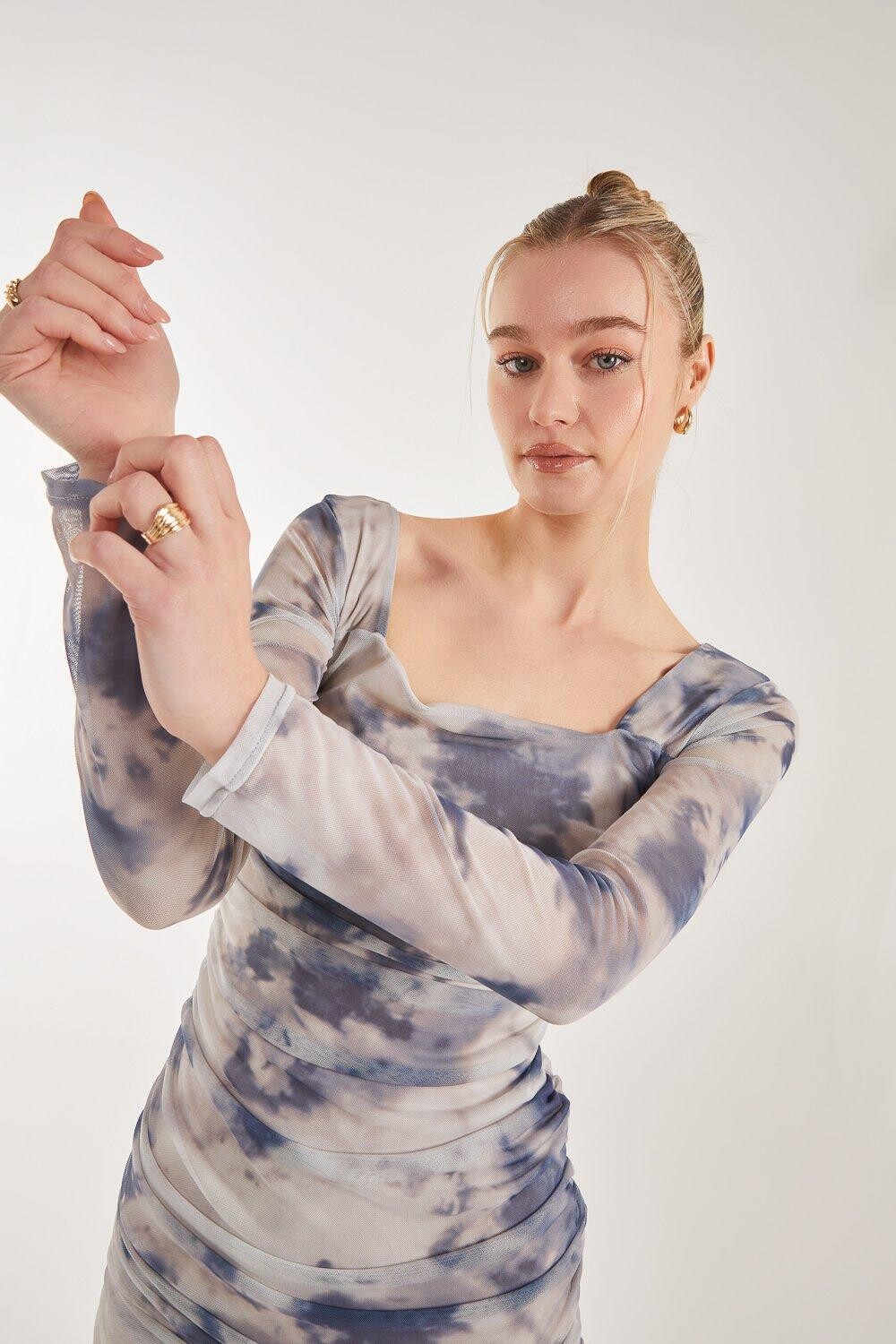 В этом платье есть все нужные вибрации. Ткань с потертым принтом кремовых и синих тонов подчеркнет ваш силуэт на вечеринке!
