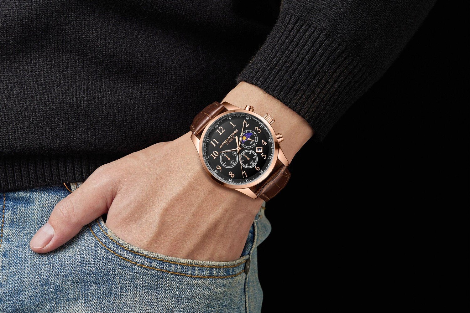 Мужские часы Anthony James, собранные вручную, ограниченным тиражом Moonphase Chronograph Rose Black, привнесут элегантный штрих в самые особые случаи, давая вам все основания нарядиться и похвастаться. Часовая и минутная стрелки из розового золота приводятся в действие кварцевым механизмом, заключенным в корпус из сплава розового золота, и снабжены прочными круглыми кнопками для легкой регулировки. Черный циферблат цвета воронова крыла украшен тремя глазками хронографа для дополнительной функциональности. Часы дополнены задней крышкой из нержавеющей стали 304 и ремешком из натуральной кожи коричневого цвета с застежкой для надежной фиксации, гарантирующей комфорт с утра и до вечера.