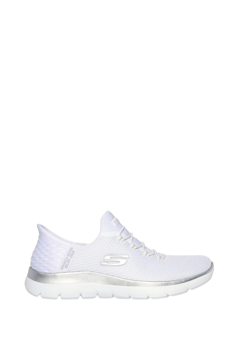 Ускорьте темп благодаря повышенному удобству ношения и платиновому комфорту в слипонах Skechers Hands Free: Summits - Diamond Dream. Этот веганский стиль с подушкой для пятки включает сетчатый верх с эластичными шнурками, металлическую отделку межподошвы и мягкую комфортную стельку Skechers из пены с эффектом памяти с воздушным охлаждением.