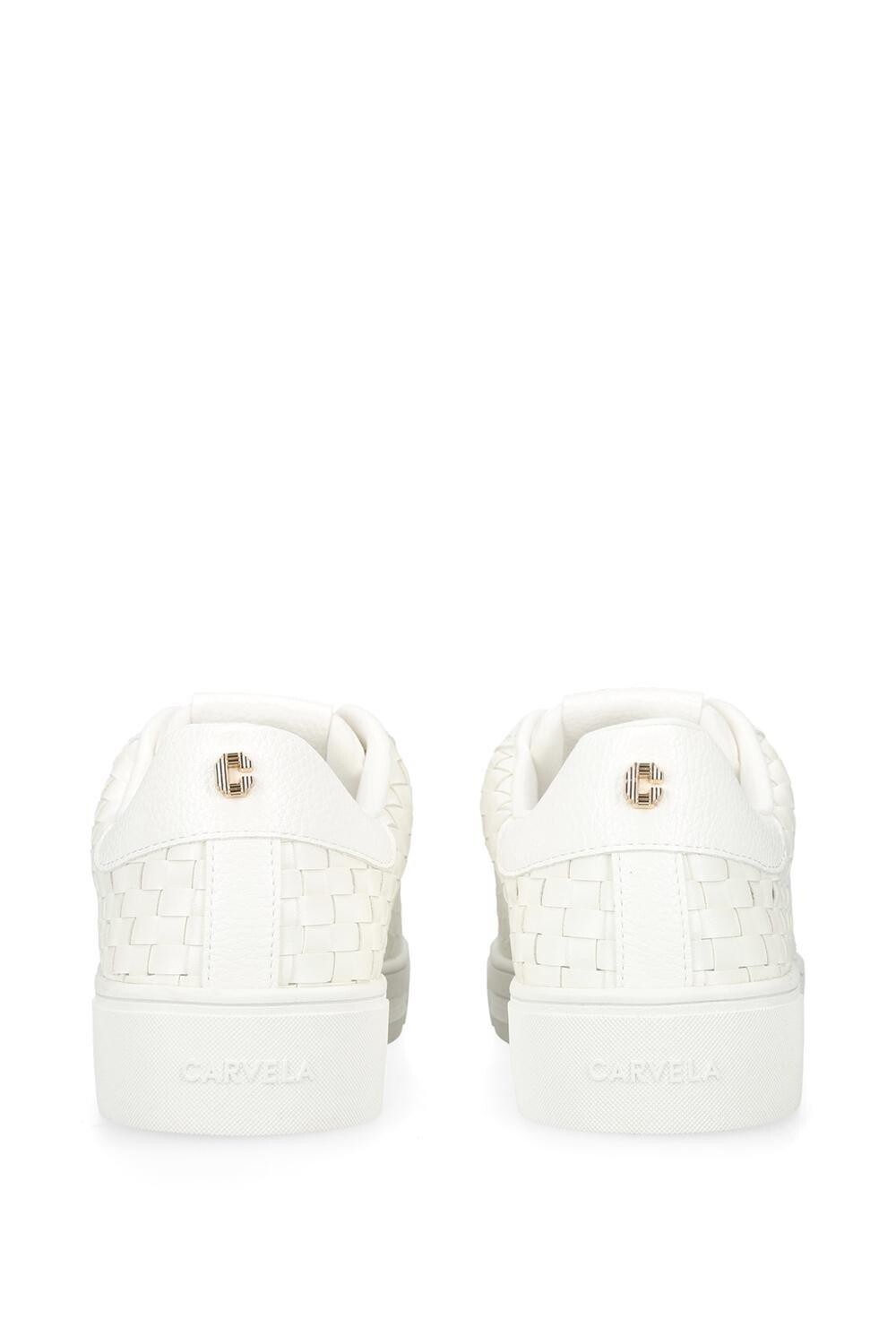 Кроссовки Carvela Daze Weave имеют белый верх и тканые боковые стороны. Фурнитура золотая, на язычке тисненый логотип из фольги.