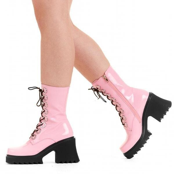 Черные пуленепробиваемые ботильоны на массивной платформе со шнуровкой. Эти веганские ботинки в стиле вестерн украшены черными шнурками и очень шикарной подошвой с зубами акулы. Эти ботинки, изготовленные из экологически чистых материалов и на 100% без жестокого обращения, настолько же этичны, насколько и стильны! – Массивная платформа – Длина до икры – Захват из акульих зубов – Черные шнурки – Серебряные люверсы – Закругленный носок – 100% веганский продукт Артикул: LMF 3731 PinkPAT