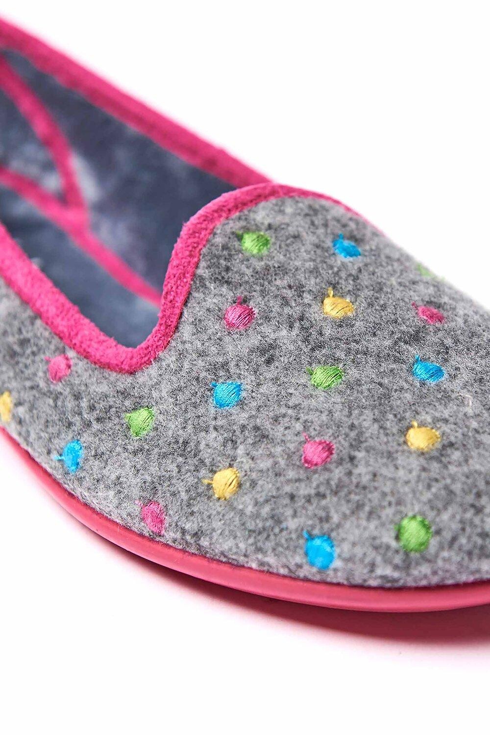 Шагните в красивый горошек с этими веселыми пятнистыми тапочками. Верх из мягкого фетра с красивой вышивкой и контрастной отделкой. практичная нескользящая резиновая подошва делает Amaretti по-настоящему весёлым фаворитом. Эти балетки очень мягкие. бархатистая текстильная подкладка делает их уютными и красивыми.