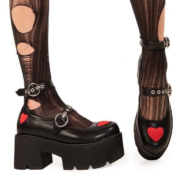 Массивные туфли Мэри Джейн Icon Rosey Love черного цвета, патент. Эти туфли Мэри Джейн украшены красными сердечками из искусственной замши на массивной и удобной подошве на платформе. Каждому нужна пара Мэри Джейн! Сделанные из экологически чистых материалов и на 100% без жестокого обращения, эти Мэри Джейн настолько же этичны, насколько и милы! – Высота платформы: 3 дюйма – Т-образная конструкция – Красные сердечки – О-образные пряжки и серебряные люверсы – Массивная подошва на платформе – Круглый носок – 100 % веганский Артикул: LMS 449 – Черный PAT/красный