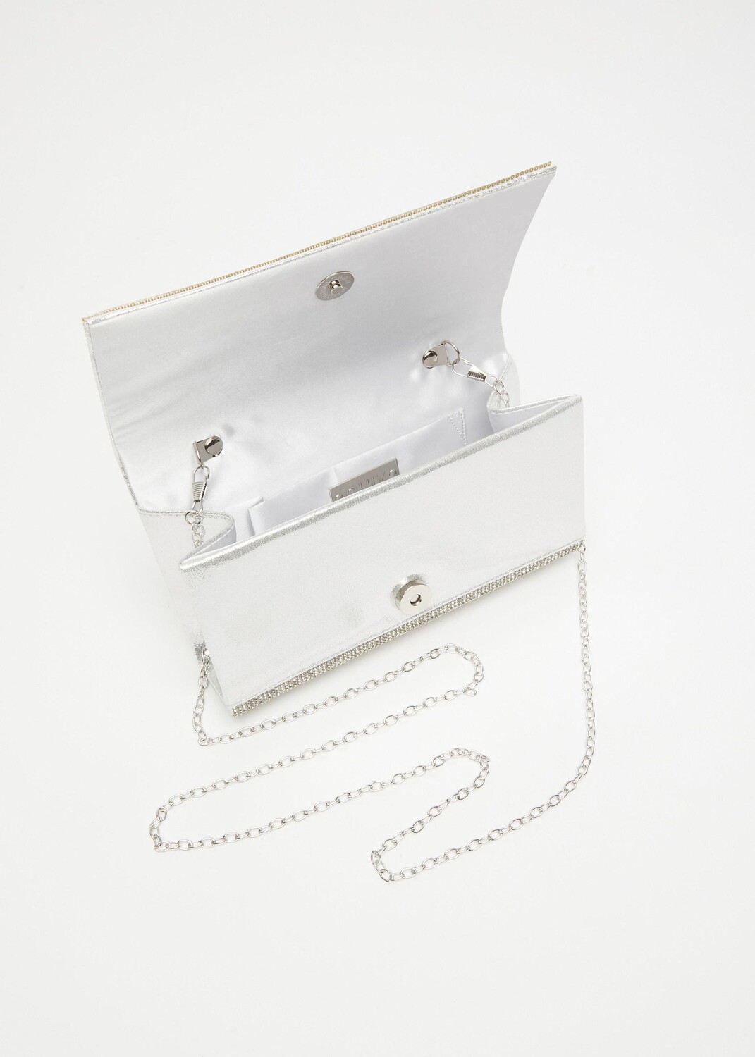 Прямоугольный клатч с серебряной отделкой. Идеально подходит для вечернего выхода, оснащен ручкой-цепочкой, обеспечивающей универсальность вариантов укладки.