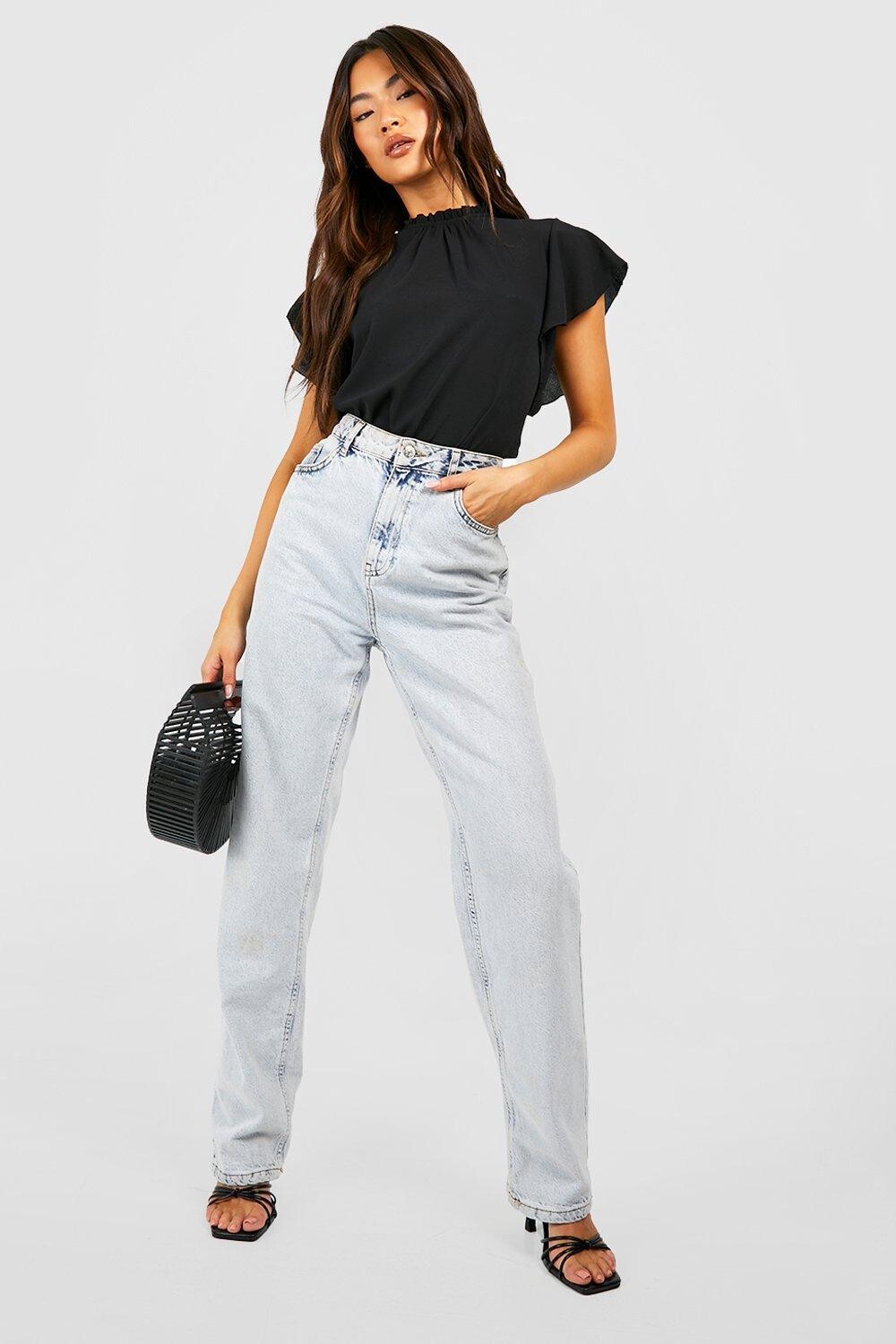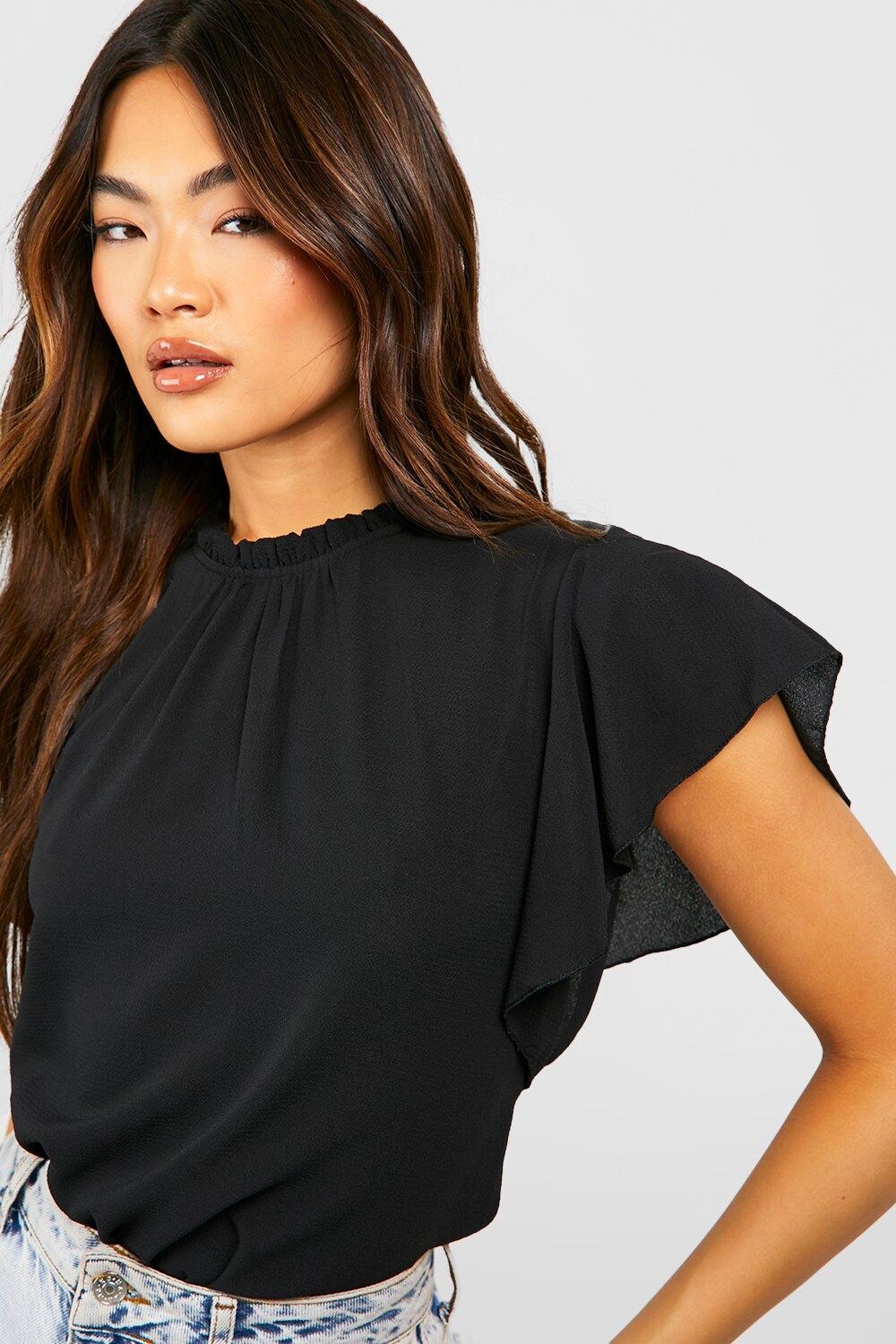 Эта блузка с оборками на рукавах поможет создать яркий женственный образ. Эта шифоновая блузка с оборками, присборенной вокруг шеи и короткими рукавами с оборками, станет идеальным дополнением к основным джинсам и брюкам с талией в виде бумажного пакета. Для придания дерзости заправьте ее в пару с завышенной талией. Стиль: БлузкаДизайн: ОднотоннаяТкань: ШифонДлина: ОбычнаяВырез: Круглый Длина рукава: Короткий рукав