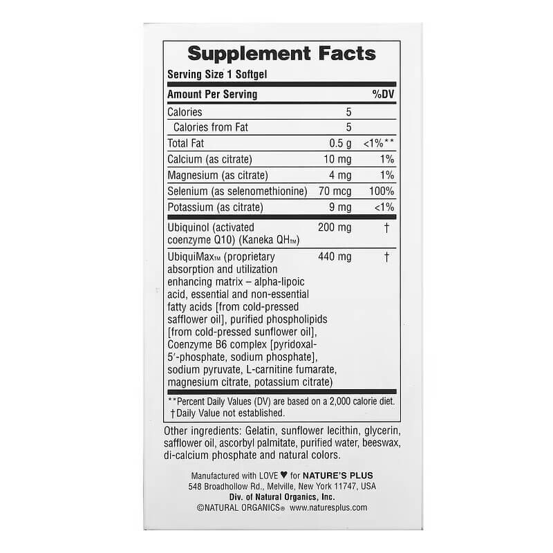 UbiquiMax (запатентованная матрица, улучшающая всасывание и использование - альфа-липоевая кислота, незаменимые и заменимые жирные кислоты [из сафлорового масла холодного отжима], очищенные фосфолипиды [из подсолнечного масла холодного отжима], комплекс коэнзима B6 [пиридоксаль-5' -фосфат, фосфат натрия], пируват натрия, фумарат L-карнитина, цитрат магния, цитрат калия) 440 мг