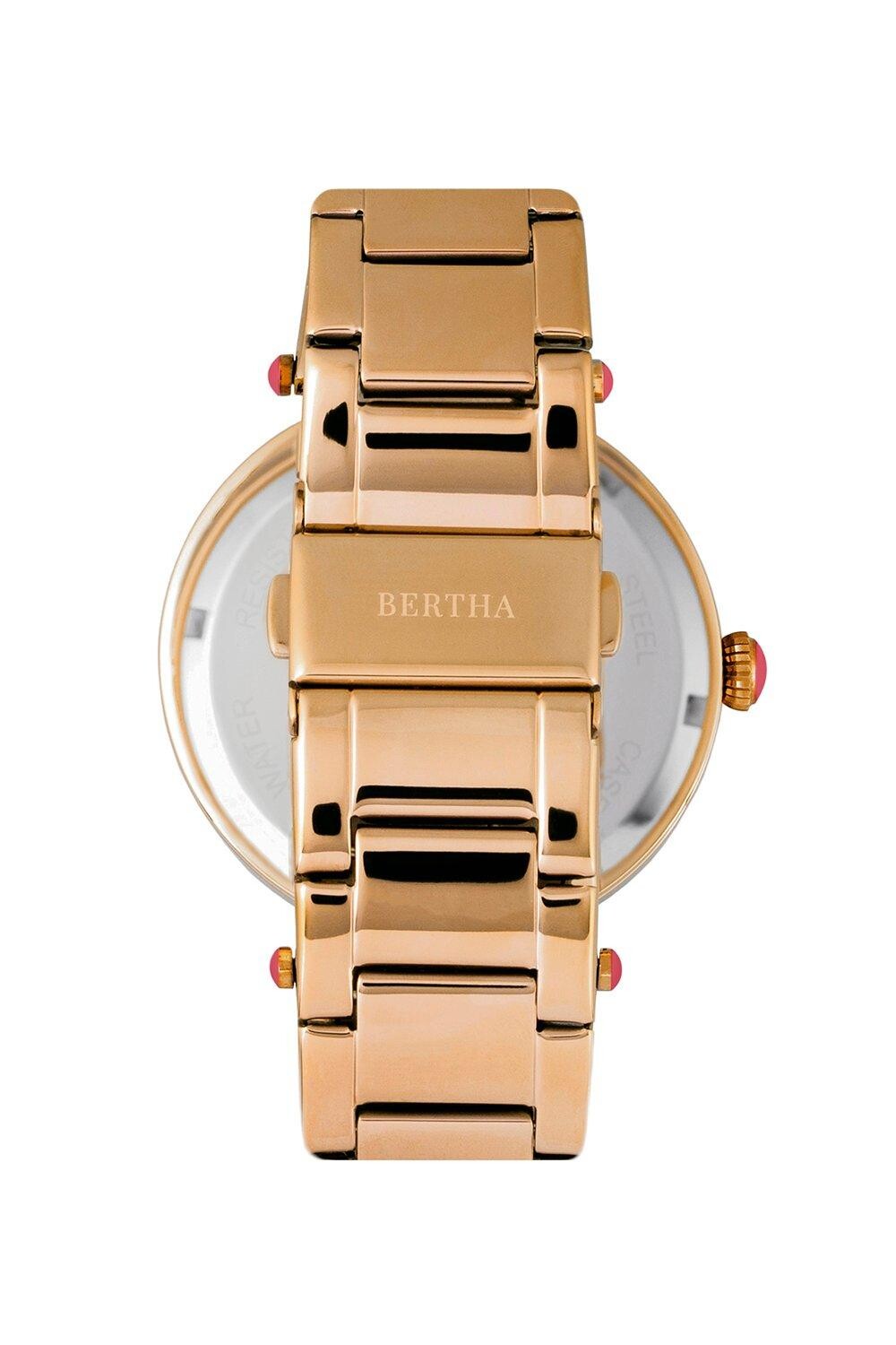 Bertha Camilla включает в себя следующие особенности: корпус из нержавеющей стали хирургического качества 316l, прецизионный кварцевый механизм. небликующее, устойчивое к царапинам минеральное стекло, перламутровый циферблат с индивидуальной гравировкой, задняя крышка из нержавеющей стали с выгравированным логотипом безель с хрустальной окантовкой, заводная головка с цветными эмалированными наконечниками, браслет из хирургической нержавеющей стали 316l, ушки для ремешка с цветными эмалированными наконечниками Раскладывающаяся застежка из нержавеющей стали с выгравированным логотипом, светящиеся стрелки, диаметр 38 мм, водонепроницаемость 3 АТМ.