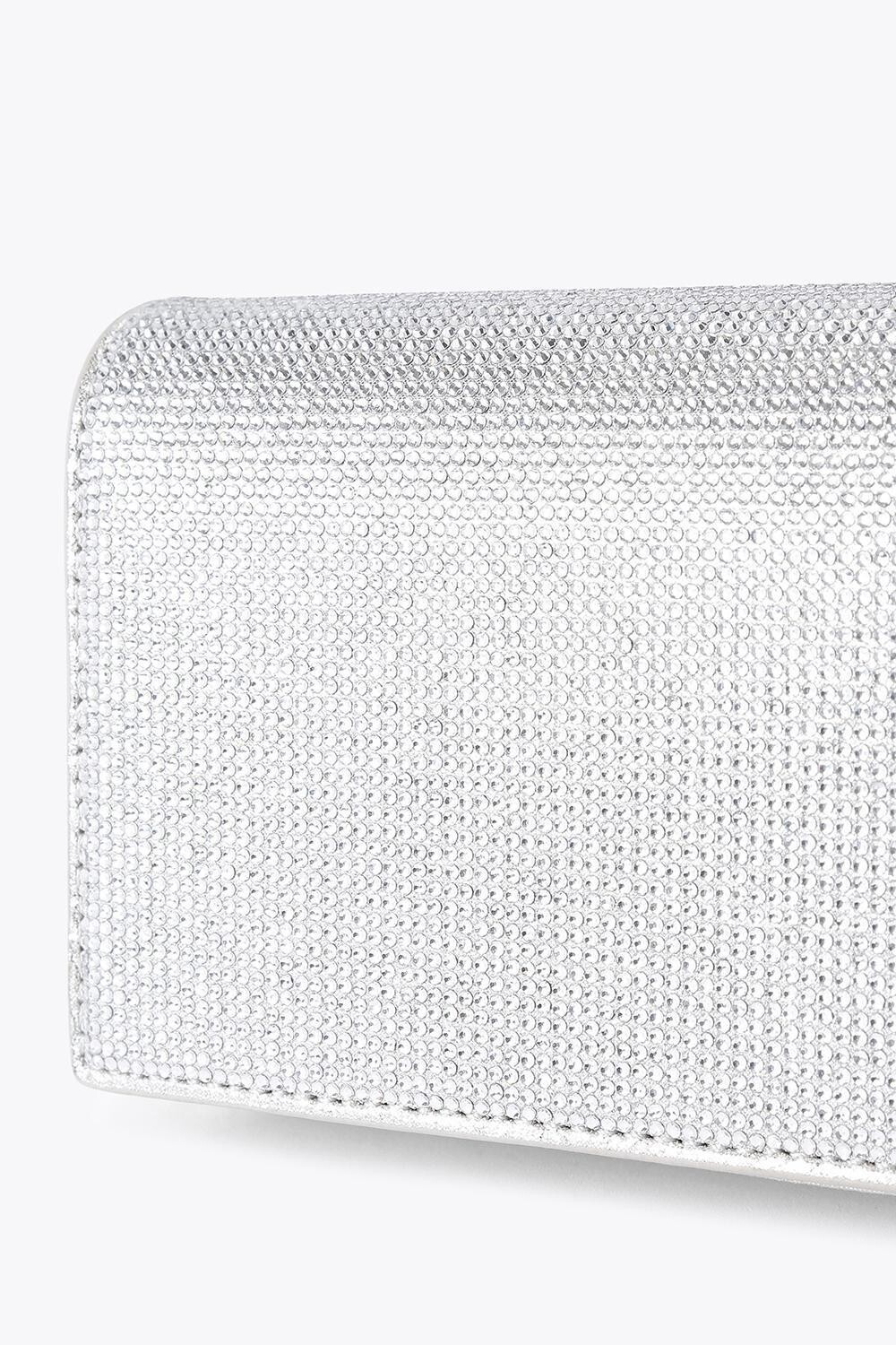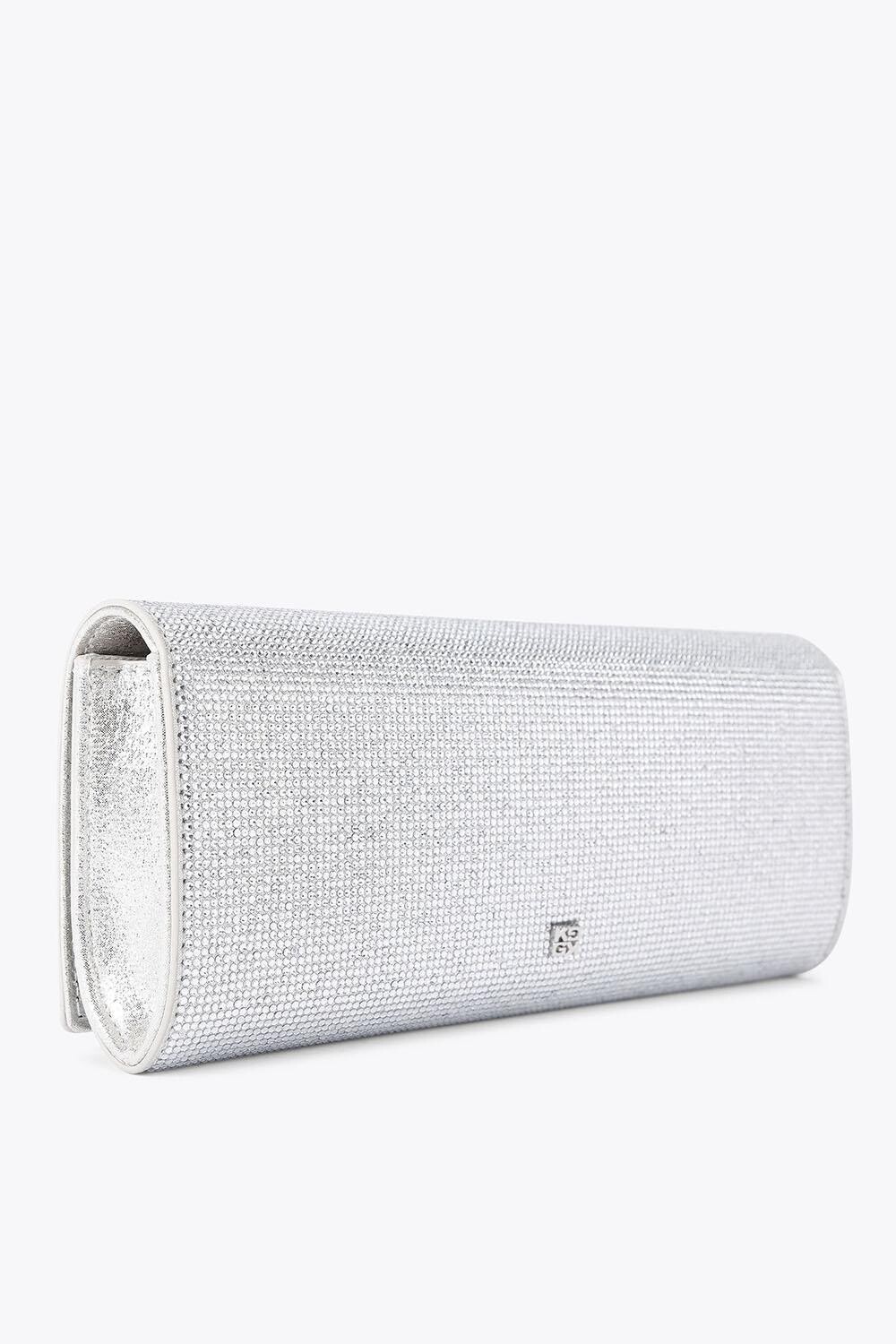 KG Kurt Geiger Baily — удлиненный клатч, выполненный из серебристой ткани и украшенный кристаллами. На задней стороне сумки имеется небольшая застежка-булавка KG Kurt Geiger. 10 см (В), 25 см (Д), 4 см (Г). Длина ремешка: 86см.