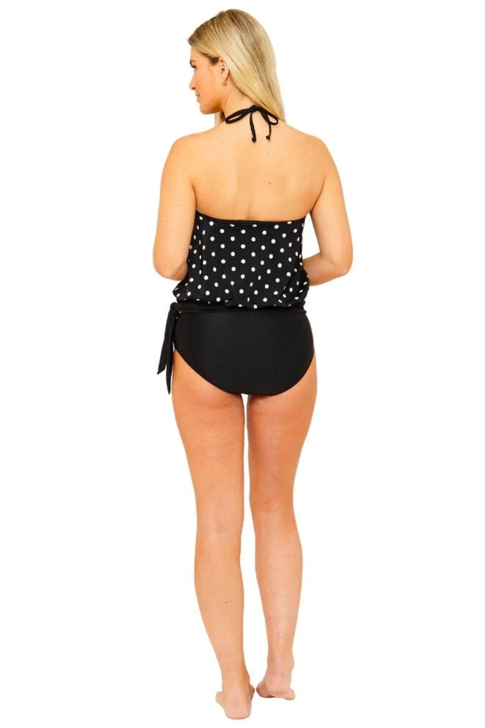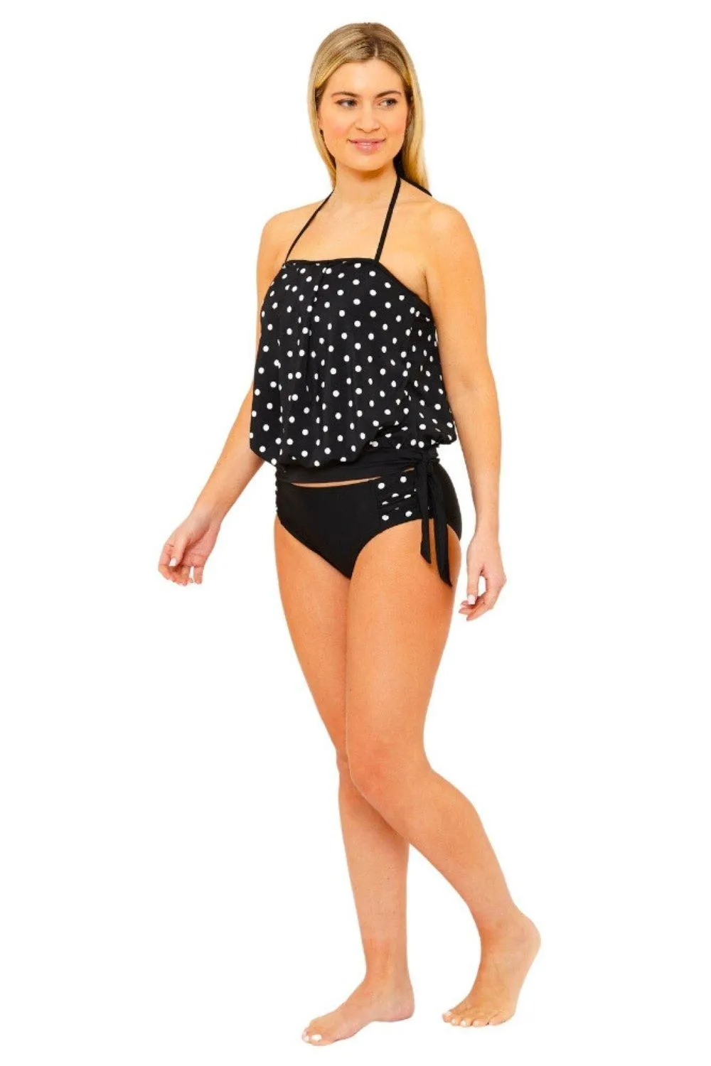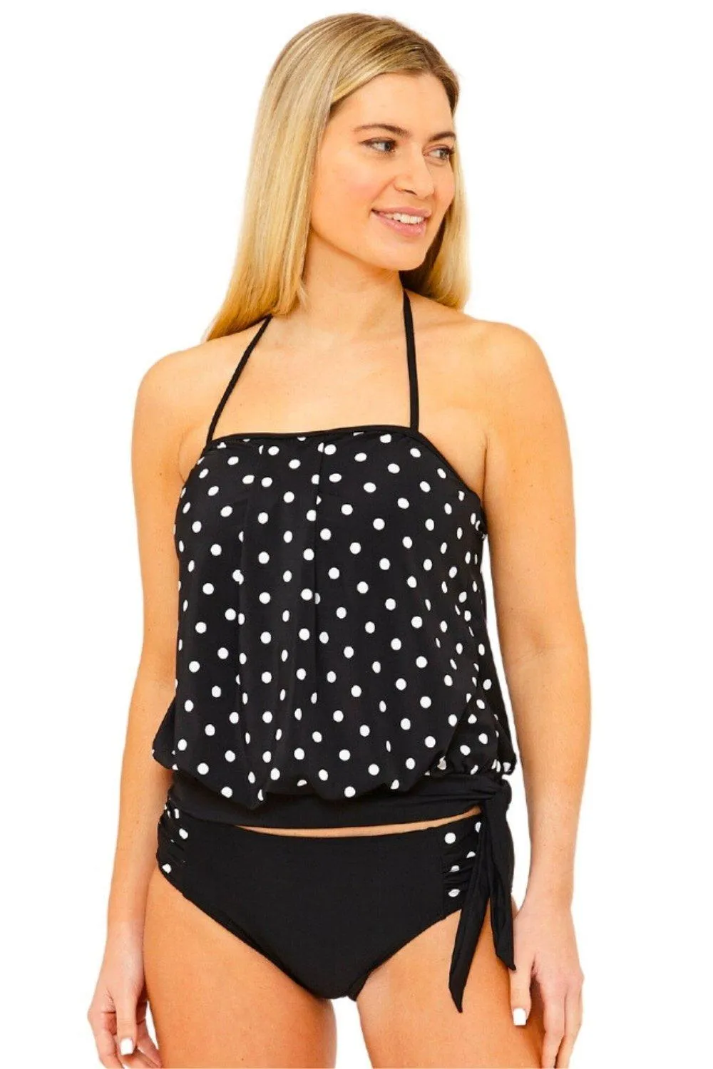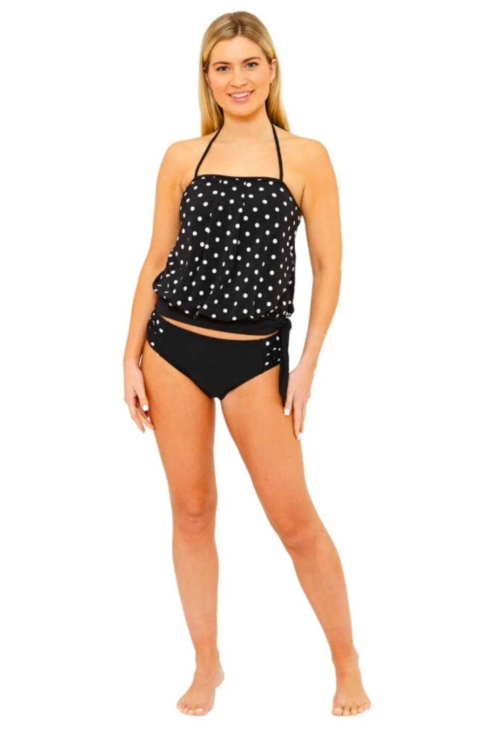 Женский комплект танкини с блузкой и драпировкой спереди. Топ-бандо с фиксированной эластичной внутренней поддержкой груди. боковая деталь завязки на талии и шейный ремешок. Соответствующие трусы со сборками по бокам и подкладкой спереди. Пояс сидит на талии отверстие для ног находится в паху. Длина бокового шва около 10см. Гибкая, быстросохнущая ткань. устойчив к хлорированной и соленой воде. Доступен выбор простых и печатных дизайнов. в этом диапазоне доступны другие соответствующие стили. Обратите внимание, что этот стиль не имеет мягкой подкладки или косточков. На нашей модели размер 10, ее рост 5 футов 8 дюймов. с обхватом груди 32C, талией 26 дюймов и бедрами 36 дюймов. Код стиля: 15-08059.