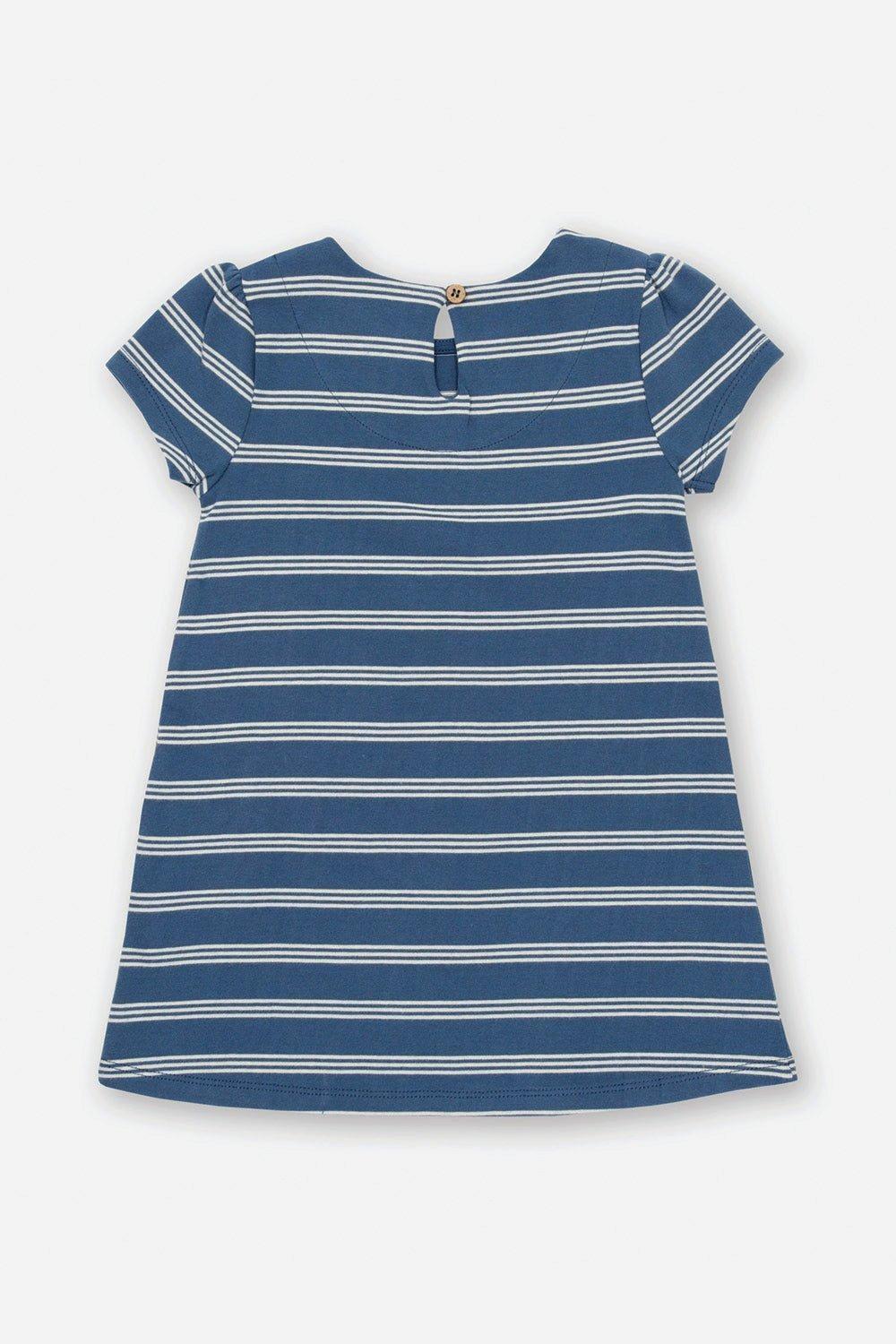 100% органический хлопок. Мы гордимся тем, что компания Control Union сертифицирована по Глобальному стандарту органического текстиля (GOTS). Полоса, окрашенная в темно-синюю и кремовую пряжу, с аппликацией теплого желтого цвета. Форма А-силуэта. Вырез сзади на шее с кокосовыми пуговицами. Короткие рукава со сборками. Круглая шея. Ткань в рубчик 1х1. Доступны координирующие элементы . Сделано в Турции. Можно стирать в машине при 40 градусах или при 30 градусах, чтобы беречь планету.
