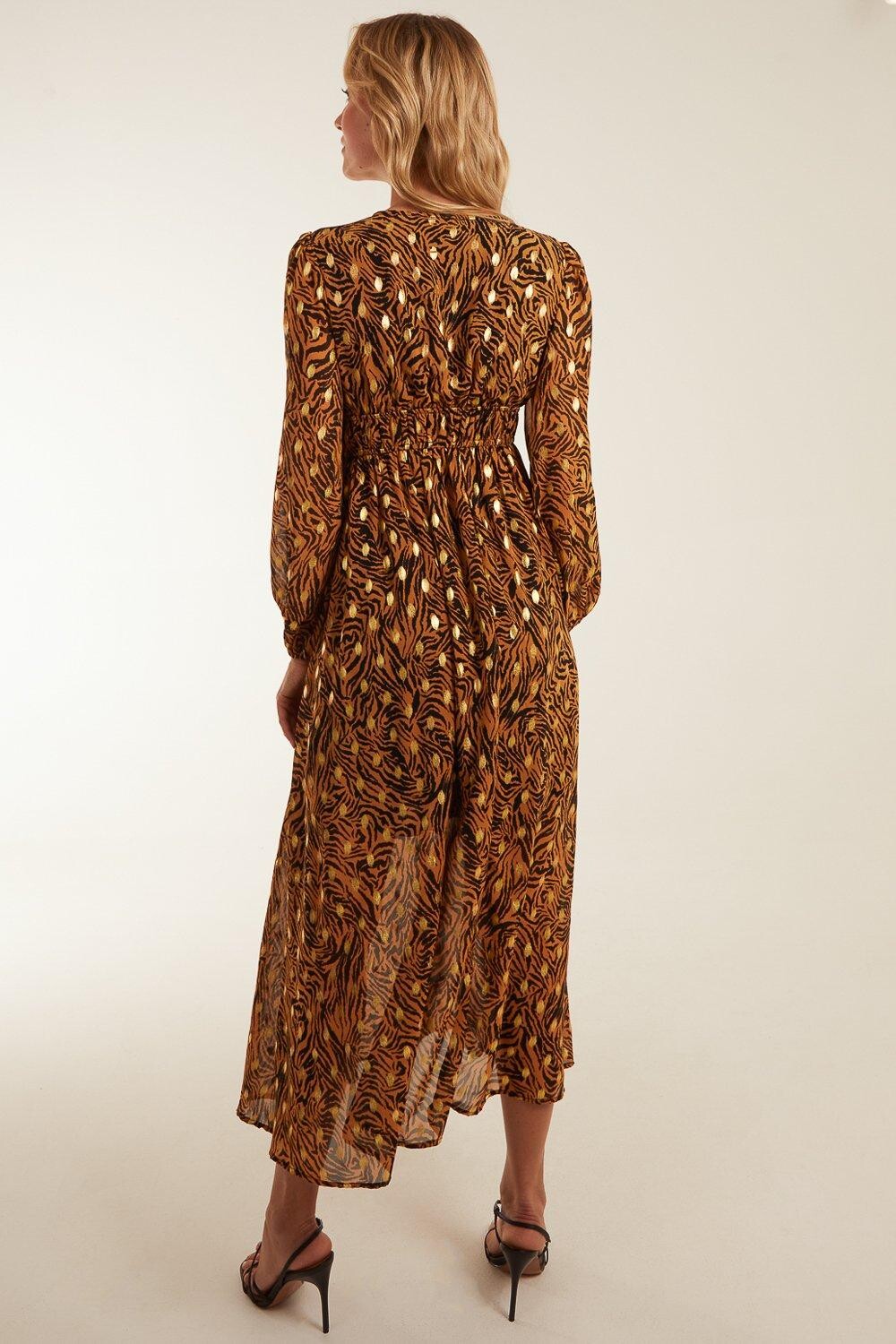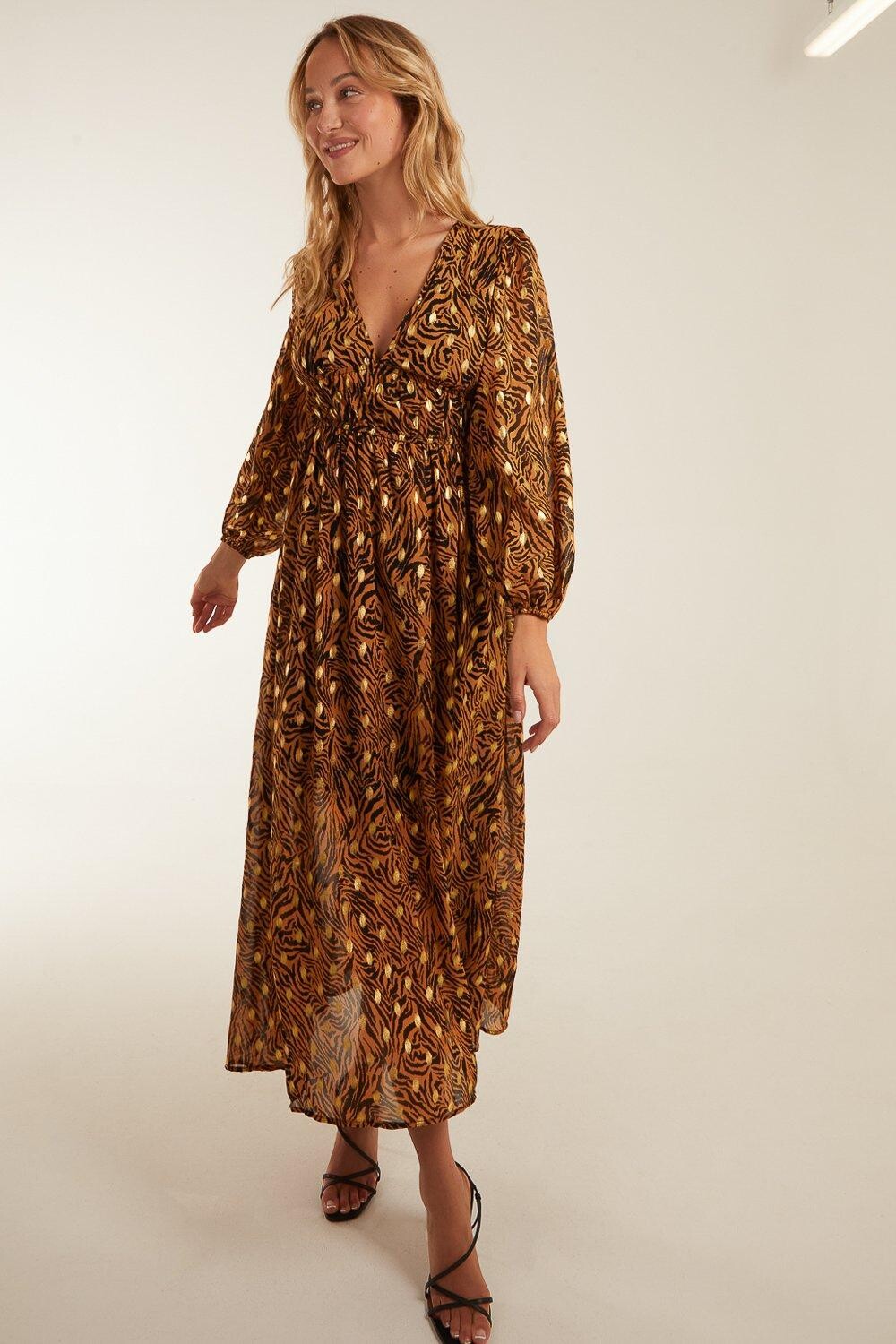 Станьте королевой джунглей в этом очаровательном платье макси с присборенной талией и принтом животных. Сексуальная и удобная, с идеальным осенним принтом – чего еще можно желать?