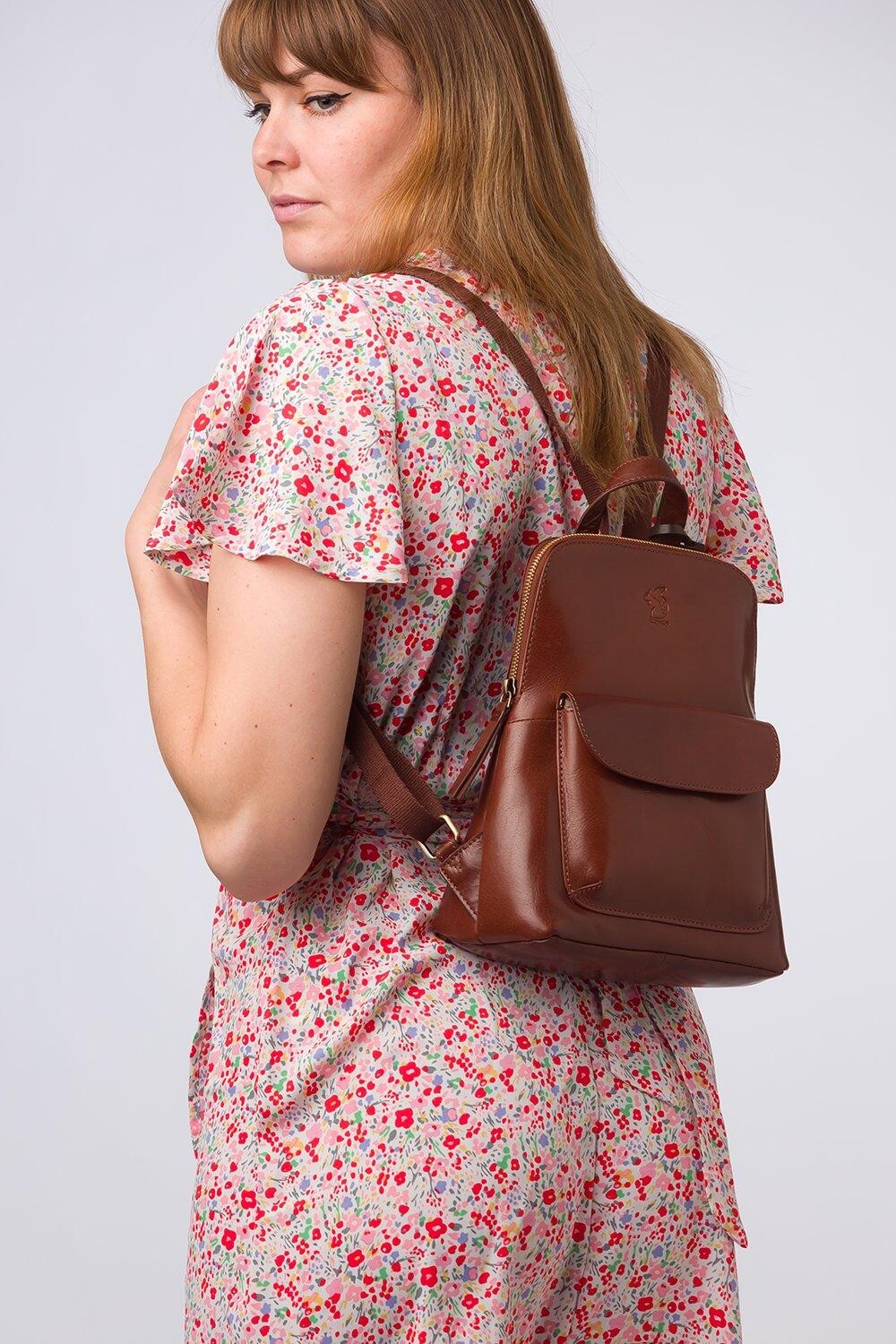 Стильный и элегантный рюкзак Kerrie из коллекции Conkca's Signature Collection представляет собой усовершенствование классического дизайна благодаря натуральной разноцветной коже. Простой, но функциональный дизайн просто необходим: просторное внутреннее пространство на подкладке из 100% хлопка дополнено двумя накладными карманами, что идеально подходит для хранения аксессуаров. Карман на кнопке на передней части сумки прекрасно дополняет это и обеспечивает надежное хранение в дороге. Кожаный обруч и регулируемые брезентовые ремни украшают сумку, а латунные металлические молнии и фурнитура придают ей изысканный вид. Все это завершается тиснением логотипа Conkca рядом с культовым шармом в виде белки — просто элегантным завершающим штрихом.