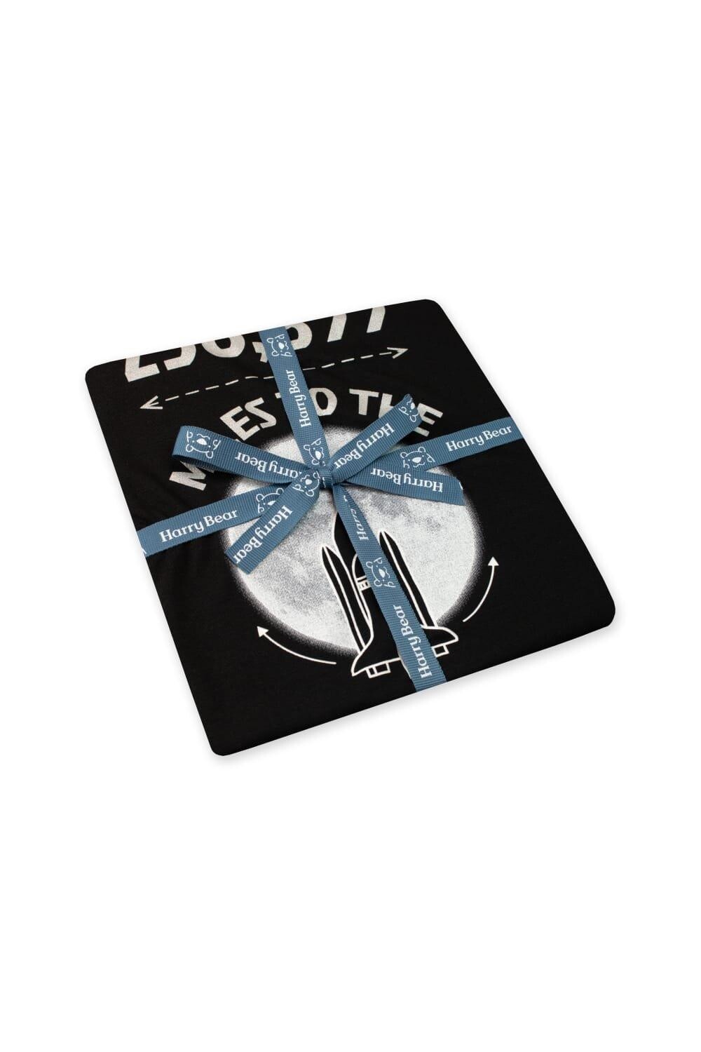 Я люблю тебя 238, 855 миль и обратно! Разработано Гарри Беаром этот пижамный комплект просто не из этого мира. На изображении изображена полная луна, силуэт космического корабля и блестящий серебряный лозунг «238». 855 миль до Луны». В сочетании с короткими пижамными штанами с изображением космических кораблей, спутников и планет. эти пижамы идеально подходят для начинающих космонавтов. В комплекте с лентой «Медвежонок Гарри», связанной вручную, она станет идеальным подарком.
