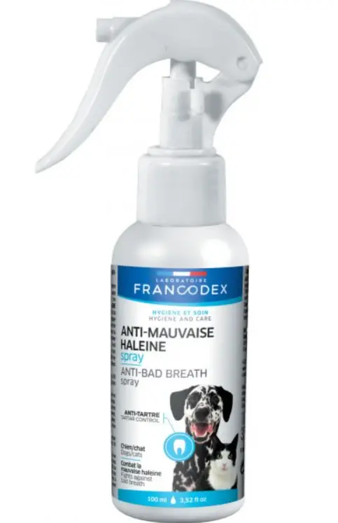 Прогрессирующее образование зубного налета является причиной накопления зубного налета на зубах, что может вызвать серьезное воспаление десен и быть болезненным. Спрей Francodex Anti-Evil содержит экстракт граната и витамин С, препятствующий образованию зубного налета, а также семена многолетних растений и пряную мяту для эффективной борьбы со злом у вашего питомца. Кроме того, витамин С помогает поддерживать здоровый образ жизни. Важно регулярно чистить зубы вашего питомца в течение первых нескольких лет жизни, чтобы предотвратить появление язв во рту и уменьшить проблемы с зубами. Свойства: Fresh Alien Anti-Sarro Восстанавливает энергию. Как использовать: разблокируйте пистолет, вращая ячейку вниз и вниз. Распылите средство в ротовую полость животного, на зубы и зубы. Максимальная эффективность. Его можно применять с 2 месяцев для собак и с 3 месяцев для кошек. Дозировка: - Собаки и кошки - Собаки 10-30 кг: 4-5 распылений в день; - Собаки> 30 кг: 10 распылений в день. 100 мл = 120 дней для собак и кошек 80 дней для собак весом от 10 до 30 кг 40 дней для собак весом более 30 кг.