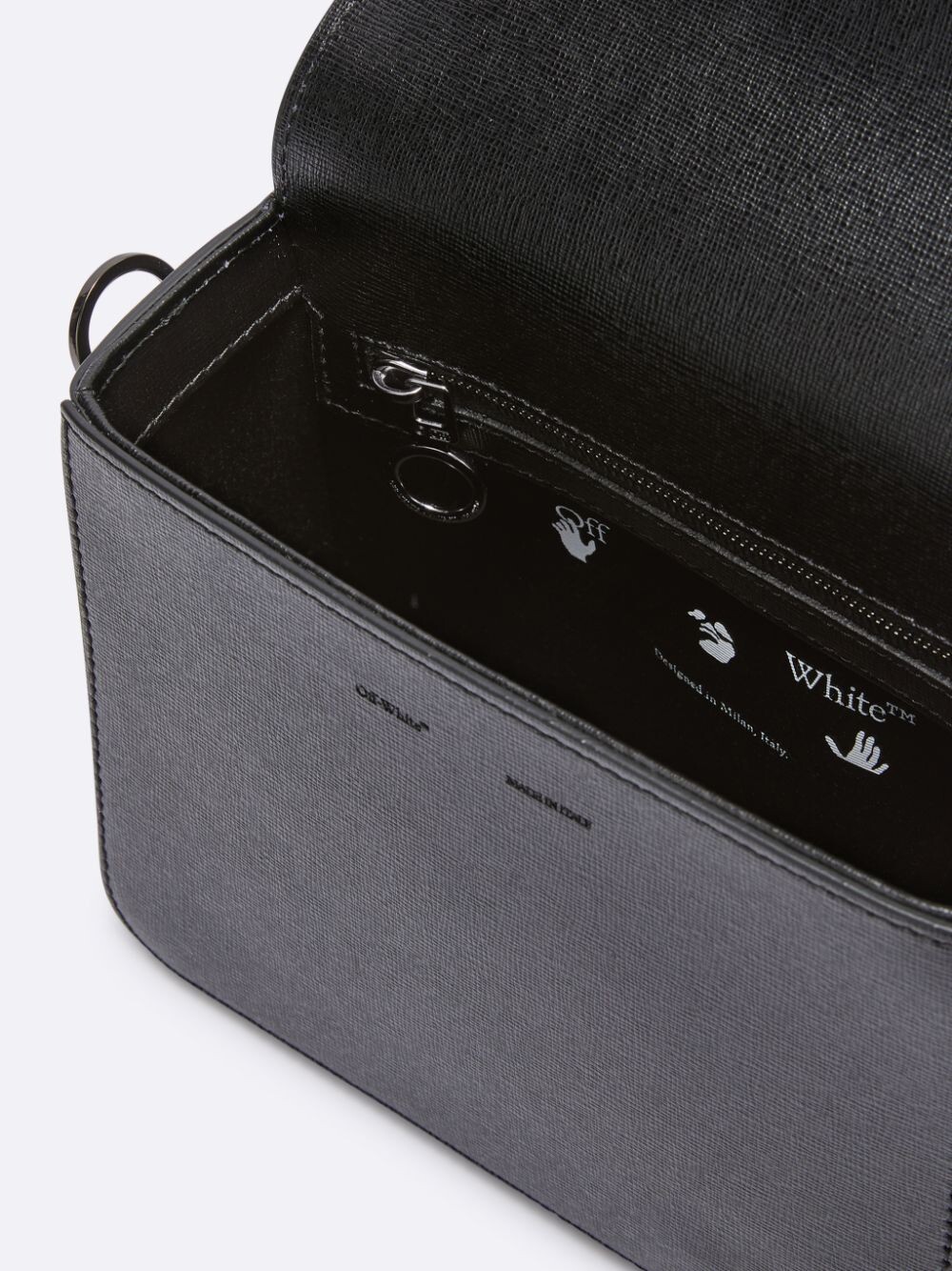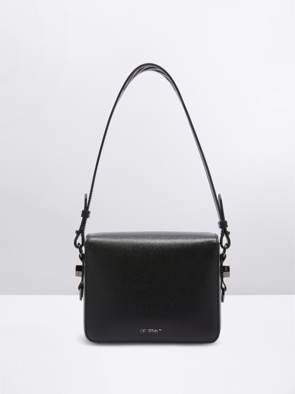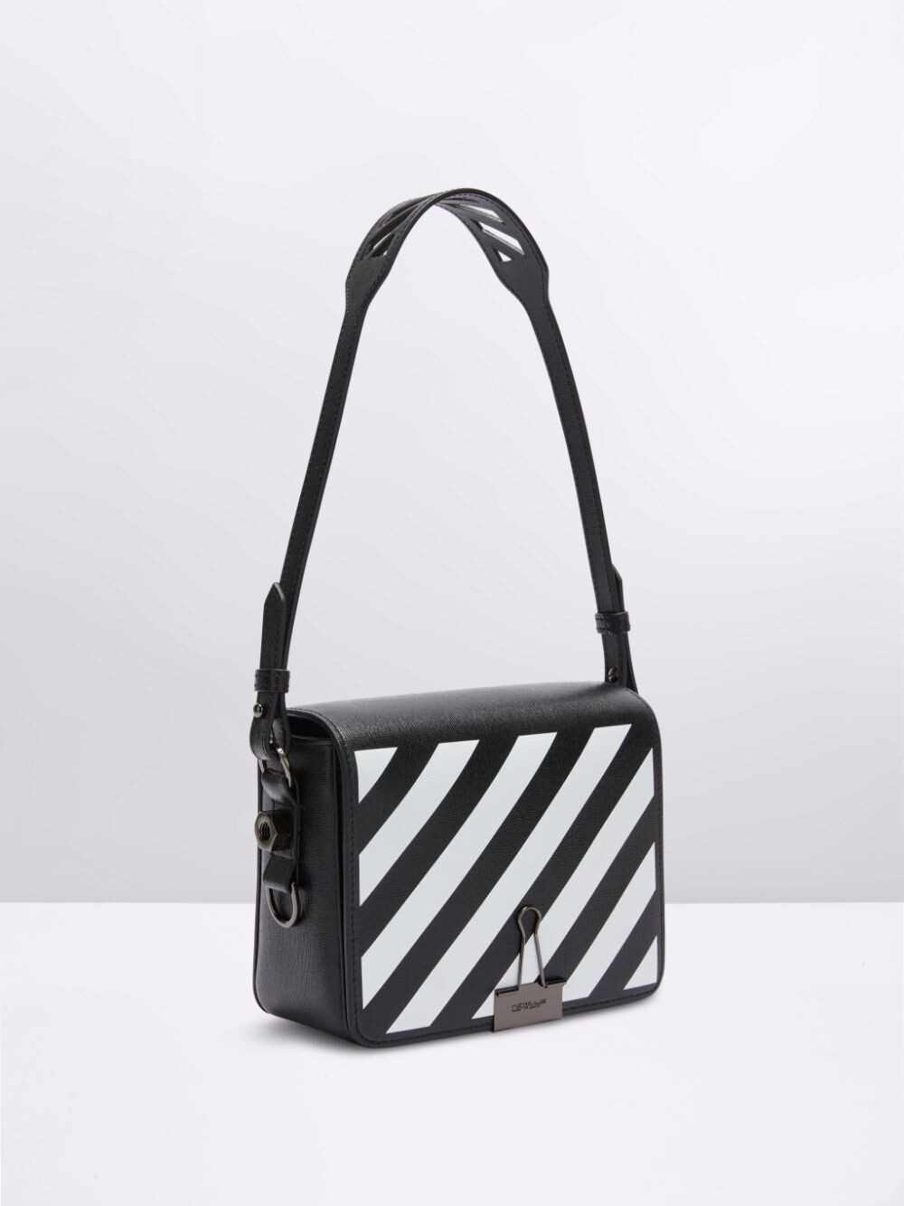 Черно-белая кожаная двухцветная сумка через плечо Diag от OFF-WHITE с диагональными полосками, двухцветным дизайном, бляшкой с логотипом, фурнитурой цвета бронзы, основным отделением и регулируемыми лямками.