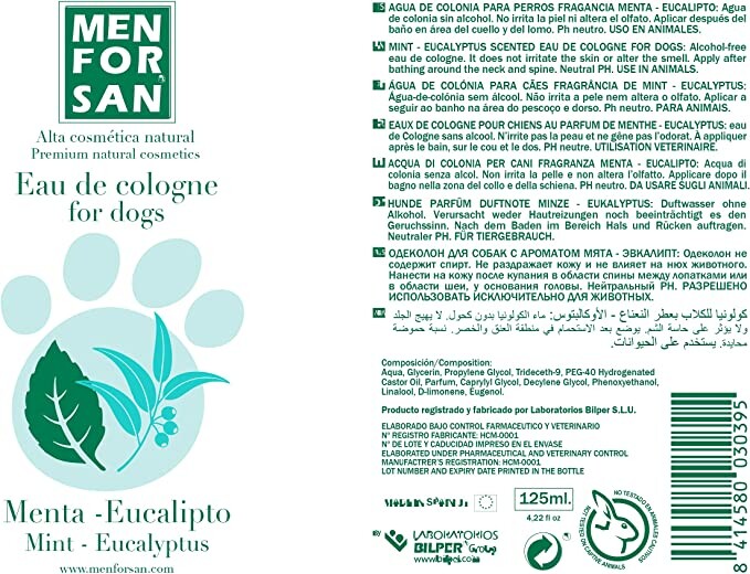 Вода Colonia для собак с ароматом мяты-эвкалипта, специально созданная для обеспечения свежего запаха после купания.