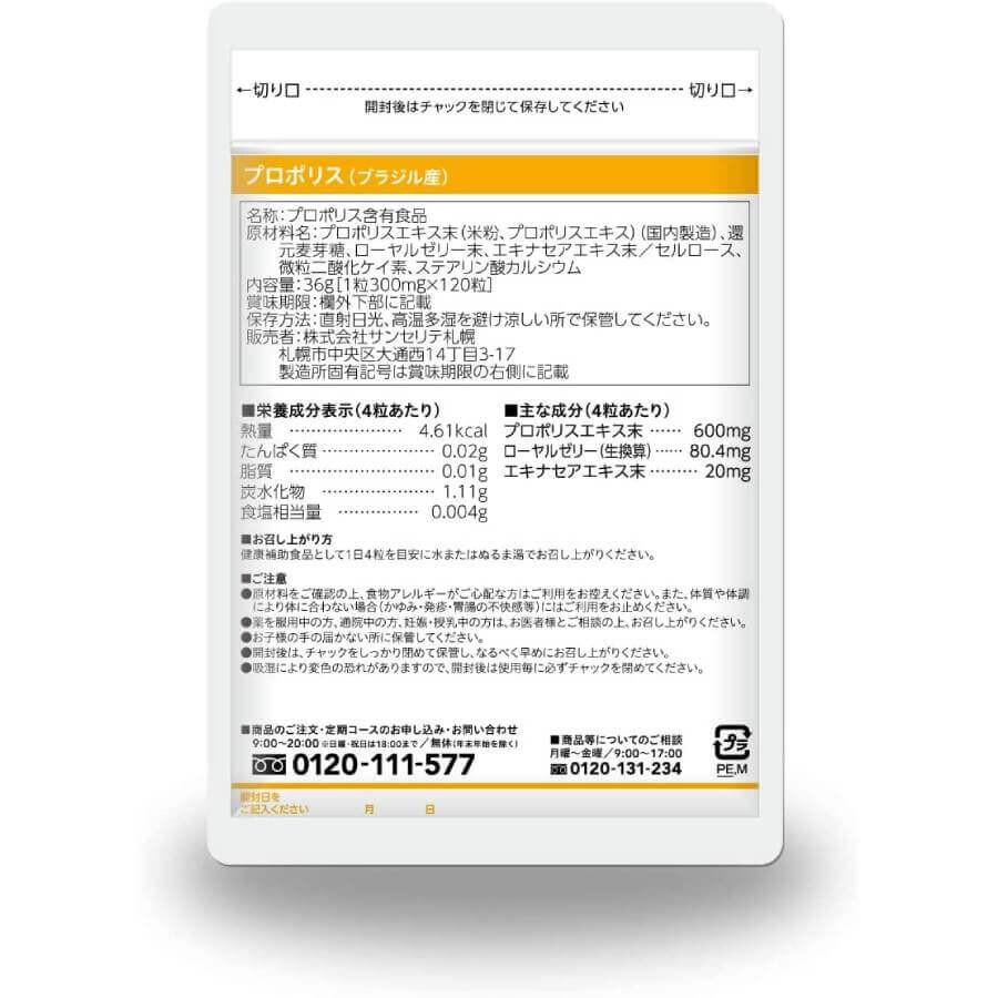 Порошок экстракта прополиса (рисовая мука, экстракт прополиса) (производство Япония), восстановленная мальтоза, порошок маточного молочка, порошок экстракта эхинацеи / целлюлоза, мелкий диоксид кремния, стеарат кальция.