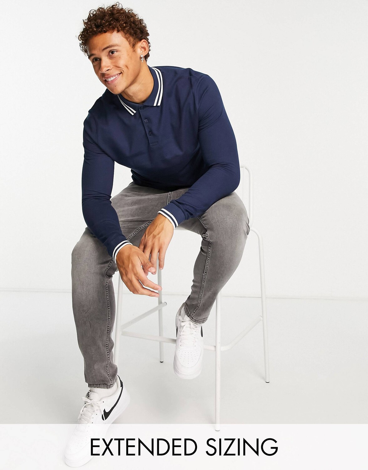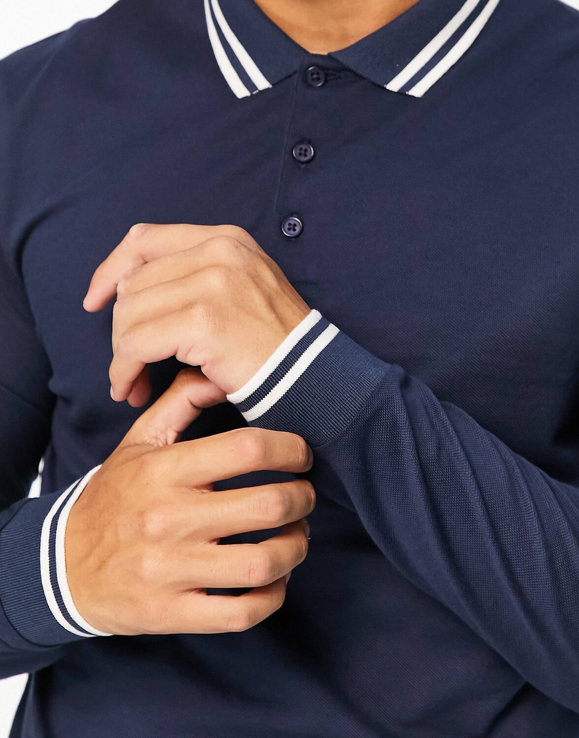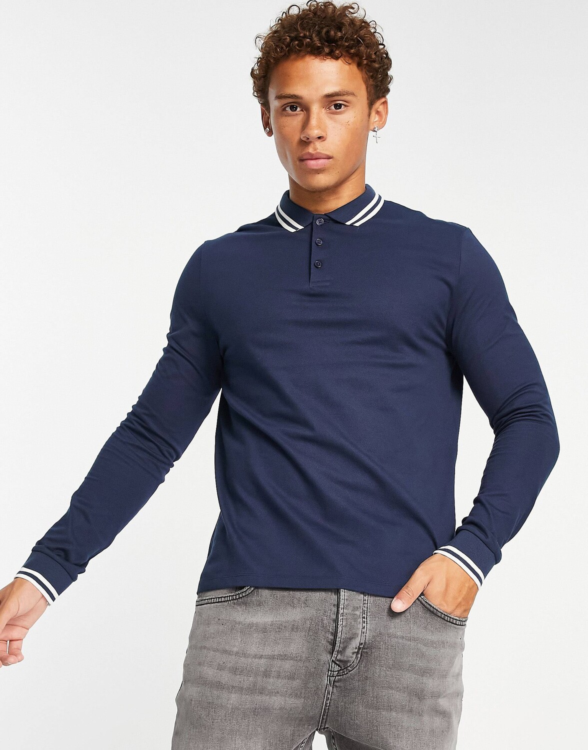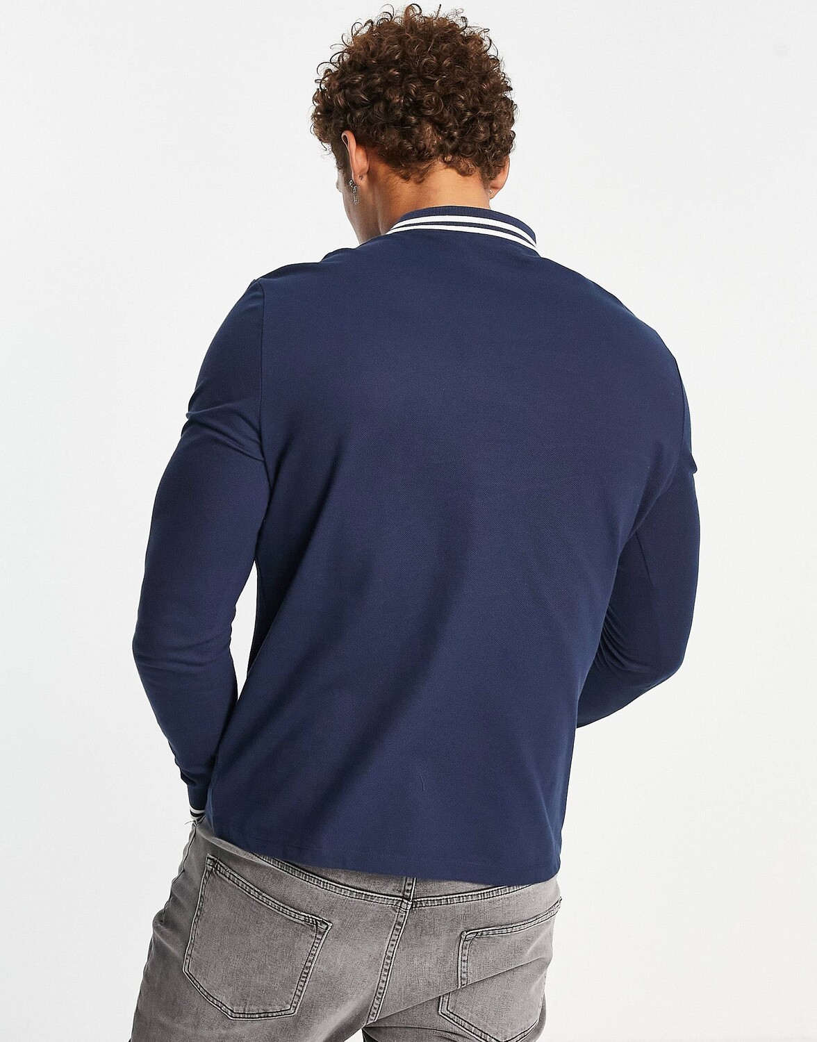 Темно-синяя рубашка-поло из пике с длинными рукавами ASOS DESIGN