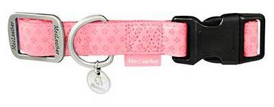 Воротник из искусственной кожи с рисунком и барельефным принтом. Функциональный, практичный и элегантный. Мягкая, комфортная, быстросъемная и прочная. Регулируемое металлическое монтажное кольцо для большей долговечности и прочности. Доступно в шести цветах и четырех размерах.