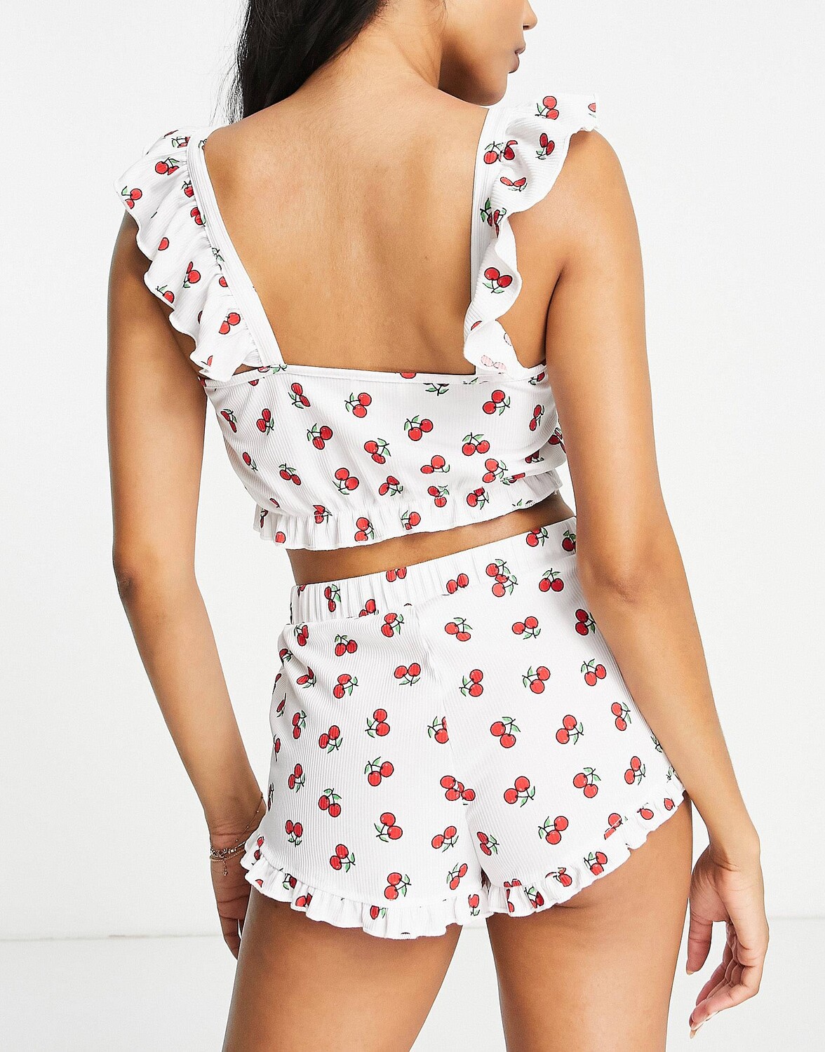 Майка Miss Selfridge с оборками и короткая пижама с принтом вишни