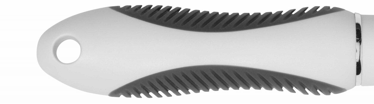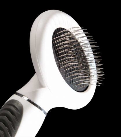 Щетка для маленьких кошек от Le Salon Essentials. у него есть проволочные свиноматки, серые и подушечки nbsp; и карбоновая ручка. & Nbsp; Рекомендуется для общего туалета.
